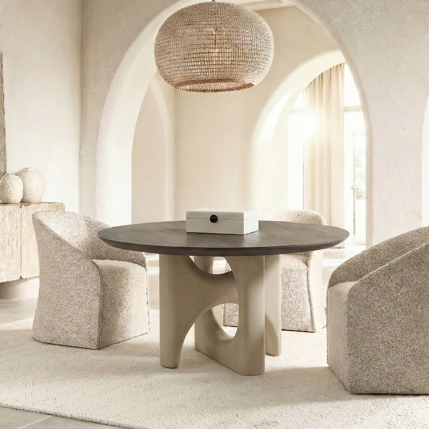 طاولة طعام أنتيب الدائرية – برنهاردت هي قطعة نحتية مميزة تجمع بين الفن المعماري والحرفية الراقية. تتميز بقاعدة متشابكة من دوائر وأنصاف أقواس مصنوعة من خرسانة معززة بالألياف الزجاجية بتشطيب بوميس ذي ملمس غني، مما يمنحها حضوراً معمارياً جريئاً. يتباين هذا التصميم مع سطح خشبي دائري بتشطيب رستك روز يضفي دفئاً وطابعاً طبيعياً أنيقاً. يحقق هذا التناغم بين الخامات العضوية والتصميم النحتي نقطة محورية راقية في غرف الطعام العصرية.