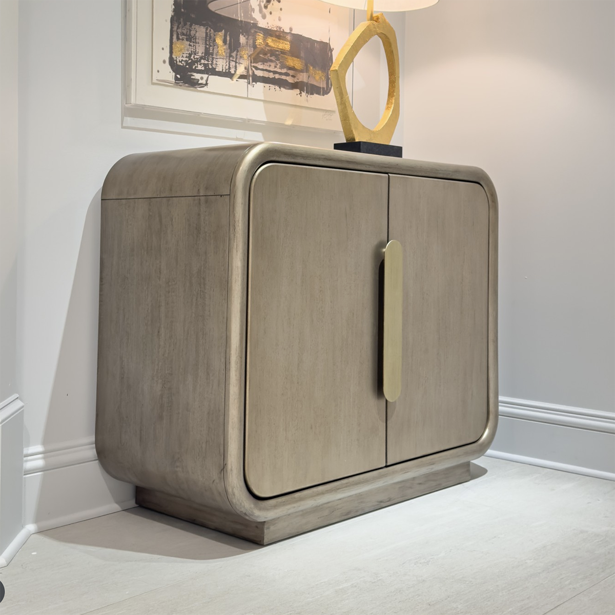 خزانة جانبية (Accent Cabinet) زوايا مستديرة وأبواب أمامية مزدوجة تجعل هذه الخزانة قطعة مثالية للترحيب في المدخل أو الرواق أو حتى كطاولات جانبية كبيرة الحجم بجانب السرير. المواد: هيكل وأبواب خشبية مع إكسسوارات معدنية.