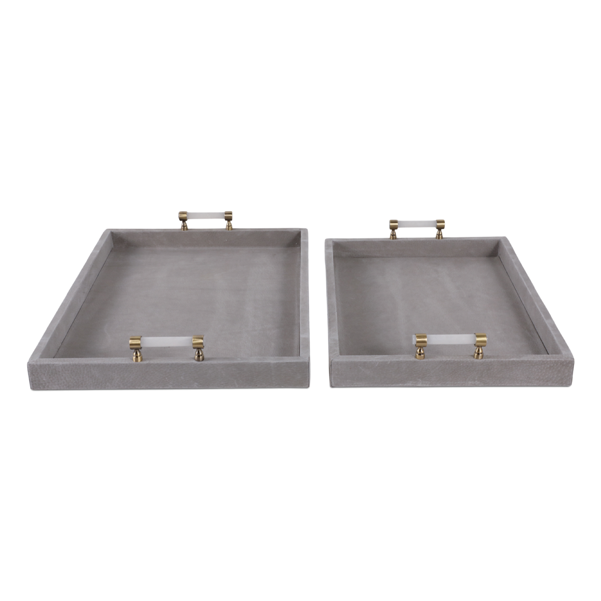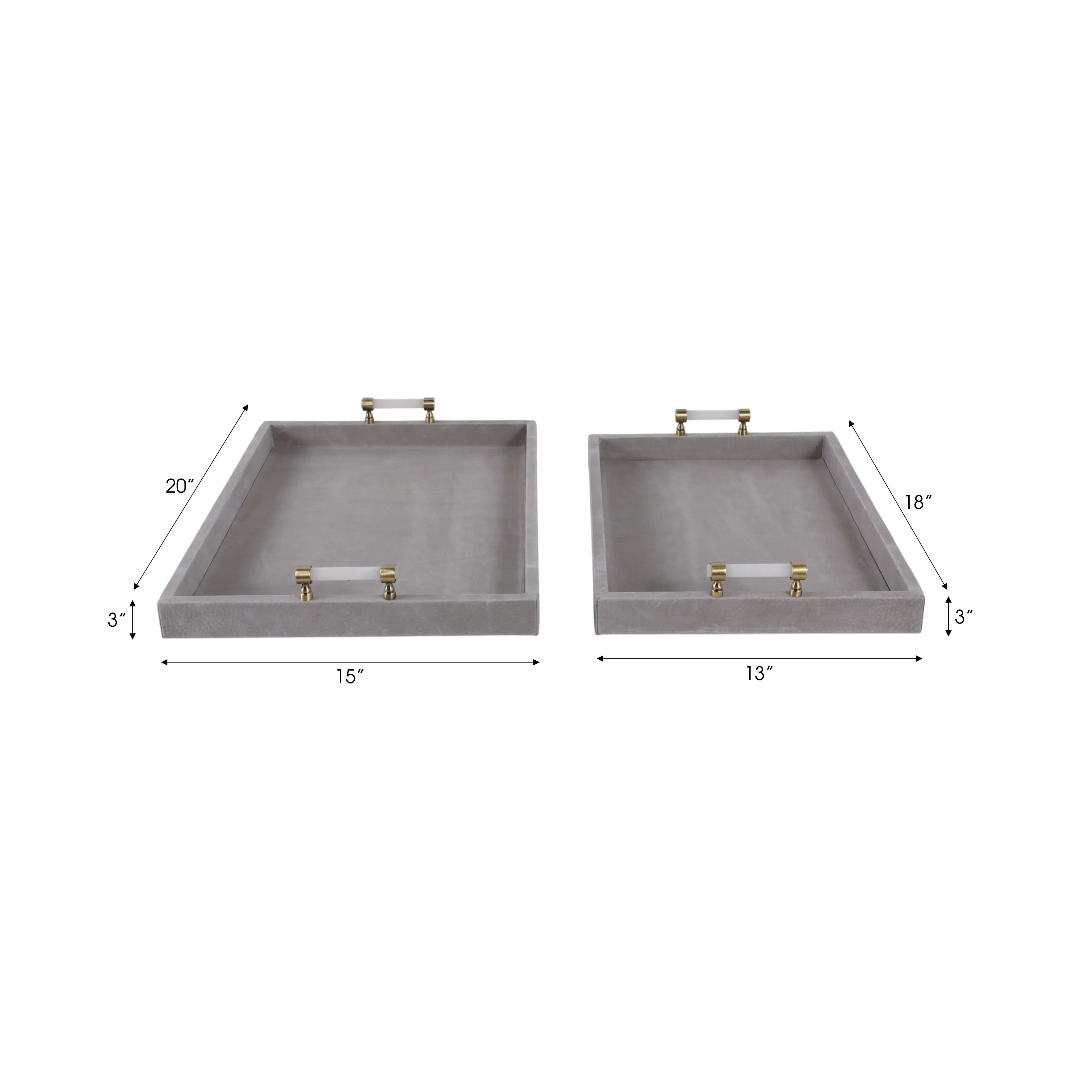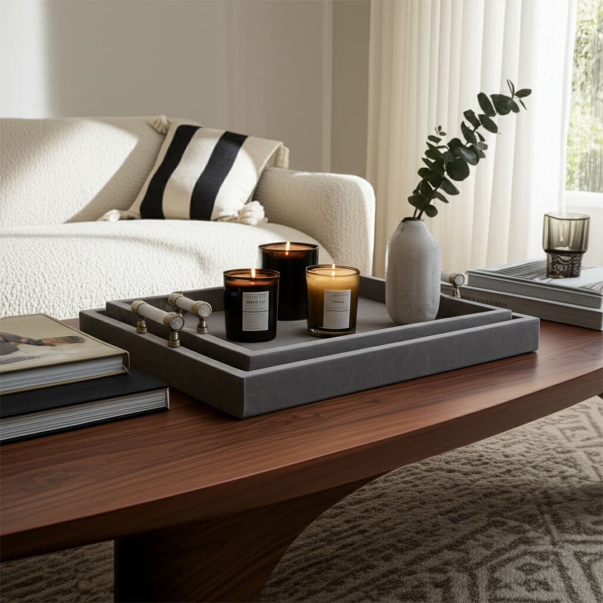 صواني أفيا من الشمواه الرمادي مع قطع زخرفية مستوحاة من حجر القمر تجمع بين ملمس الشمواه الناعم وتفاصيل تشبه حجر القمر مع قاعدة من الألومنيوم بتصميم عصري، مما يضفي لمسة فاخرة على تنسيق الطاولات والأسطح.