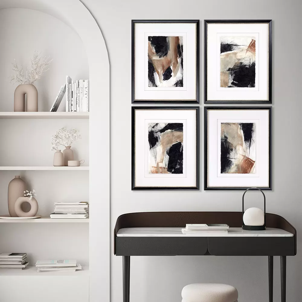 تصاميم تجريدية بحواف مشذبة يدويًا ومثبتة بتقنية التعليق العائم مع حاشية مرتفعة بلون الطين. مؤطرة بإطار خشبي أسود معتّق مع شريط زخرفي من الذهب العتيق المغسول.