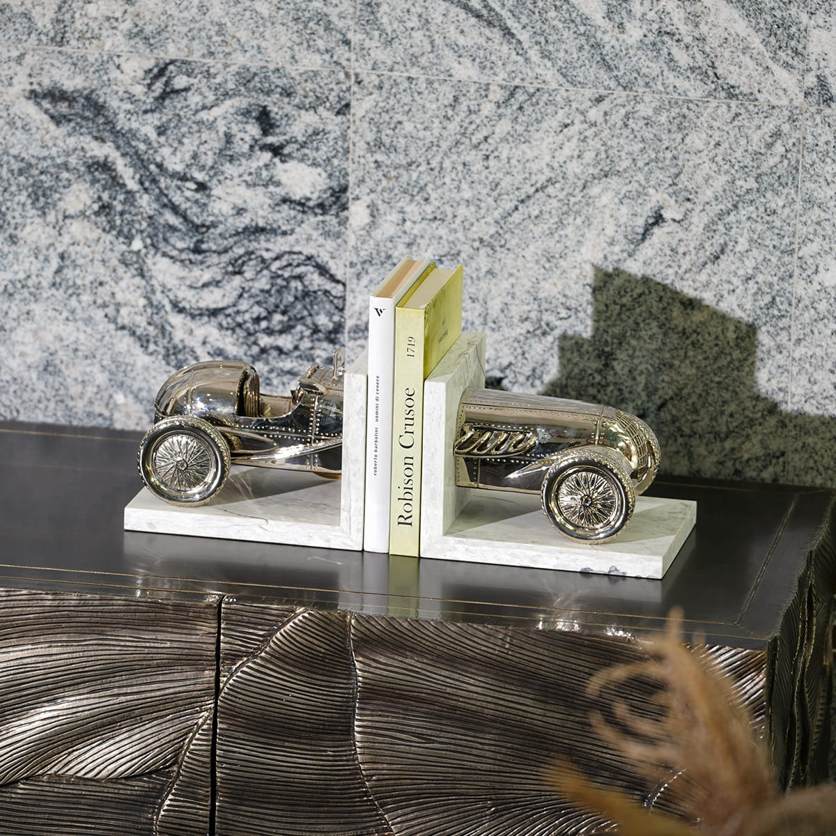 حامل كتاب رف سباق (نيكل مطلي مع رخام) تتميز هذه النسخة من حامل كتاب رف سباق بتشطيب من النيكل المطلي مع تفاصيل رخامية أنيقة. مصمم لتحقيق الاستقرار والجاذبية الجمالية، يكمل بسهولة الديكورات الداخلية العصرية بينما يضمن بقاء كتبك المفضلة في مكانها بشكل مثالي.