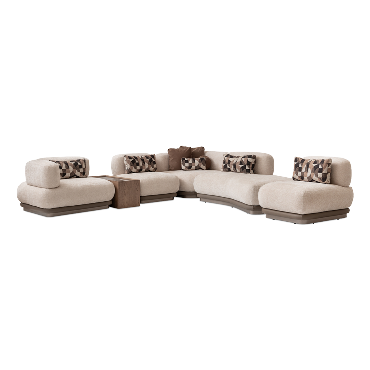 أريكة زاوية: كرسي بذراع في الجهة اليسرى، كرسيان بدون ذراع، وحدة زاوية، شيزلونغ بدون ذراع، وطاولة ركنية