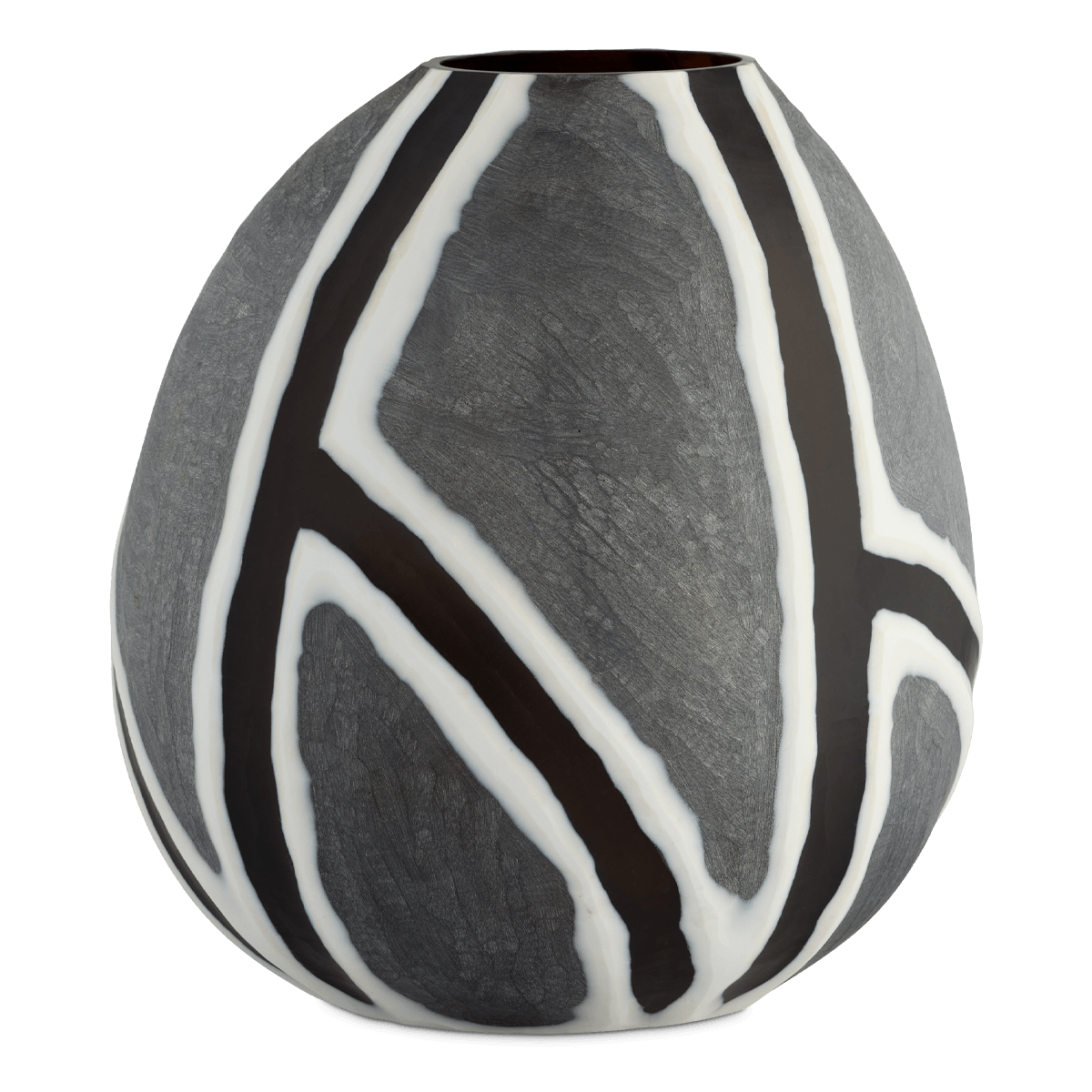 مزاهير كالي تتميّز بتصميم مستوحى من الزخارف القبلية، صُنعت من ثلاث طبقات من الزجاج المزدوج بألوان الأسود والأبيض والرمادي. أُضيفت إليها لمسات فنية بتقنيات الحفر والرمل لتمنحها عمقًا وملمسًا غنيًا وتدرجات لونية مميزة، مما يجعل كل قطعة مزيجًا فريدًا من الفن والحرفية.