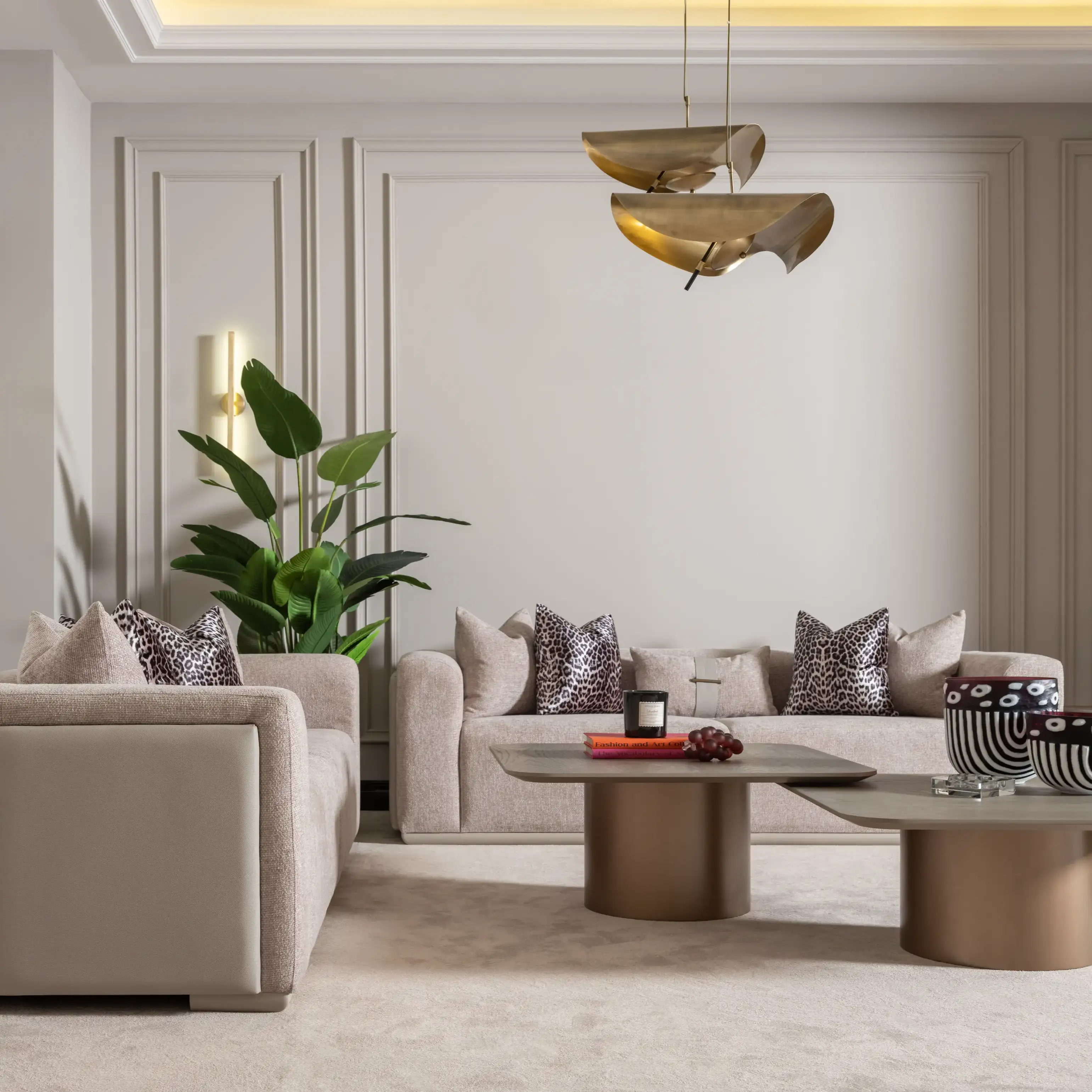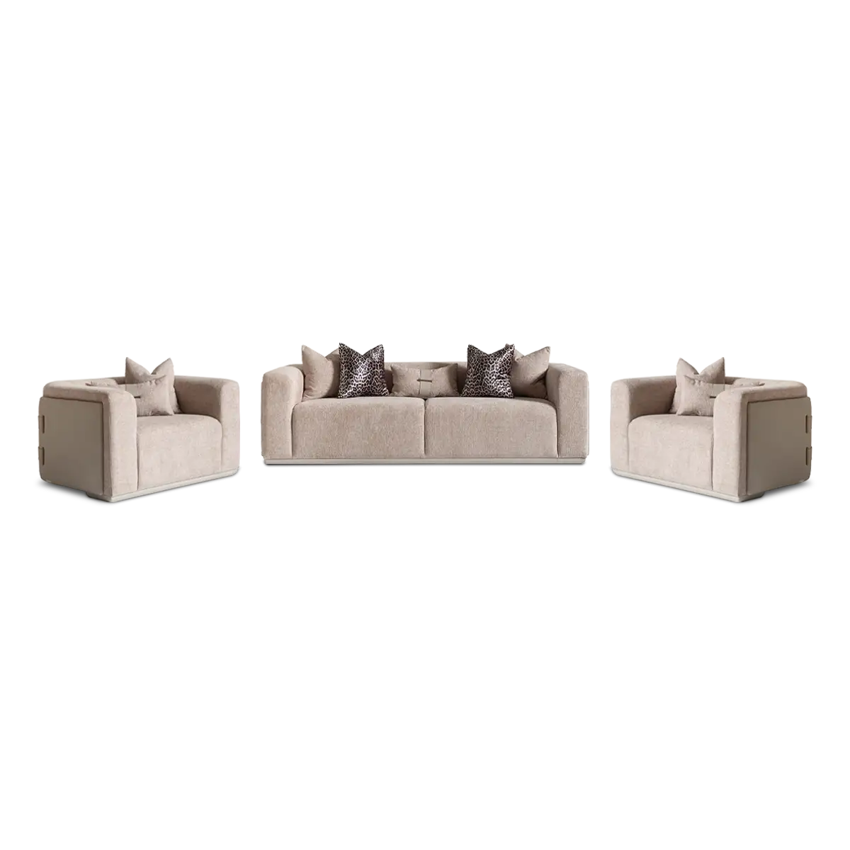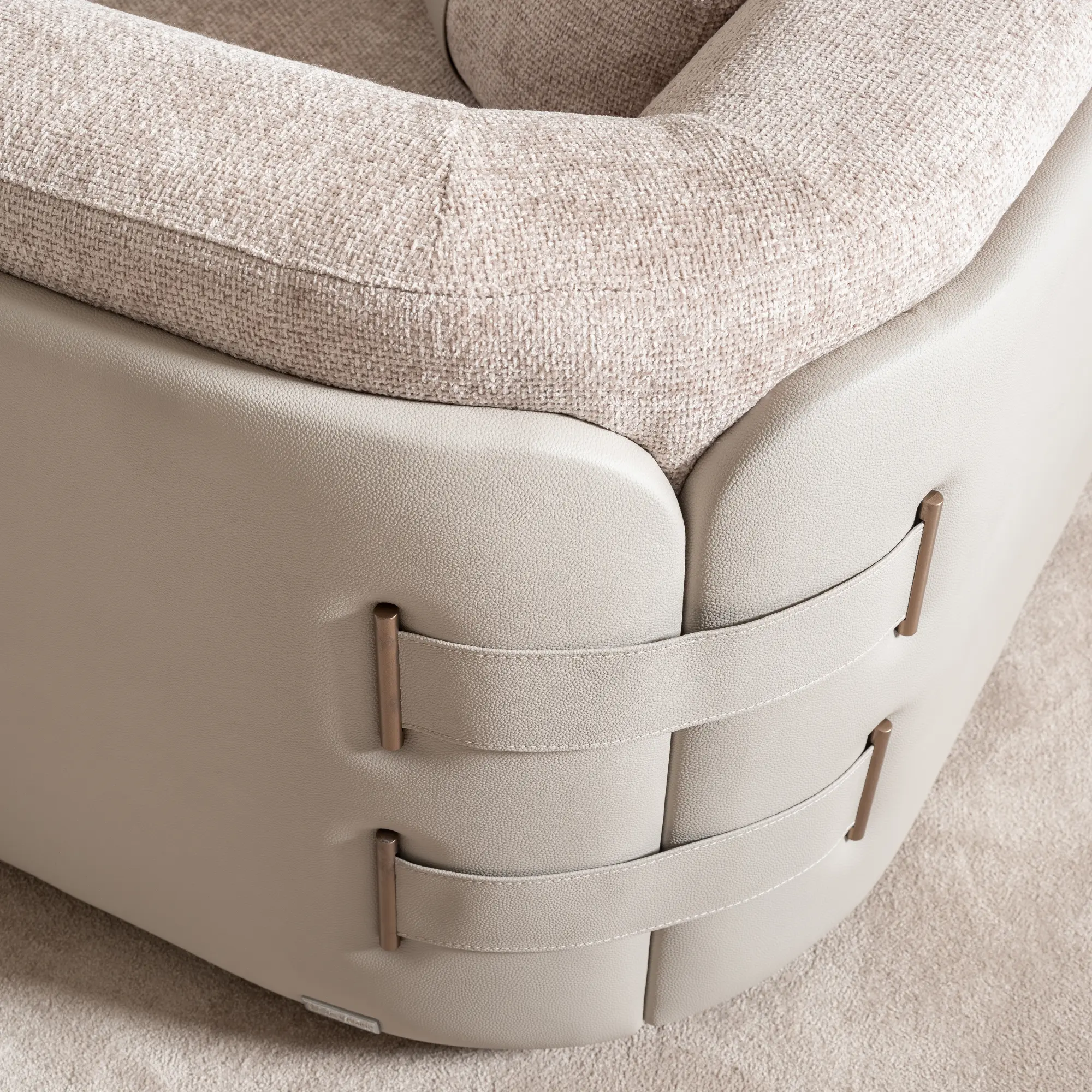 أريكة كانبيرا تمثل أريكة كانبيرا التقاء الفخامة بالراحة، حيث تتميز بتنجيد فاخر من قماش شينيل المنسوج الناعم الذي يدعوك للاسترخاء بأناقة. أما الهيكل الخارجي المصنوع من الجلد الصناعي الأنيق فيمنح تباينًا راقيًا ويبرز تفاصيل الأحزمة الدقيقة التي تضفي لمسة مميزة تميز هذه الأريكة عن غيرها. تأتي مزوّدة بخمس وسائد فاخرة لتمنحك مزيجًا متناغمًا من الجاذبية والراحة الهادئة، فيما تكمل اللمسات الذهبية العتيقة الطابع الفاخر لهذه التحفة المميزة. كرسي كانبيرا كرسي كانبيرا ونصف يُعد الإضافة المثالية لأي غرفة في منزلك، بفضل مزيجه المتناغم من الألوان الناعمة والراحة الاستثنائية. يتميز الكرسي بقماش شينيل منسوج فاخر يدعوك للاسترخاء، فيما يضفي الجلد الصناعي الأنيق لمسة متباينة راقية. وتُكمل تفاصيل الأحزمة المميزة هذا التصميم بأسلوب عصري وأنيق. سواء كان جزءًا من طقم غرفة المعيشة أو قطعة بارزة بذاتها، فإن كرسي كانبيرا ونصف يمنحك مزيجًا مثاليًا من الراحة والأناقة.