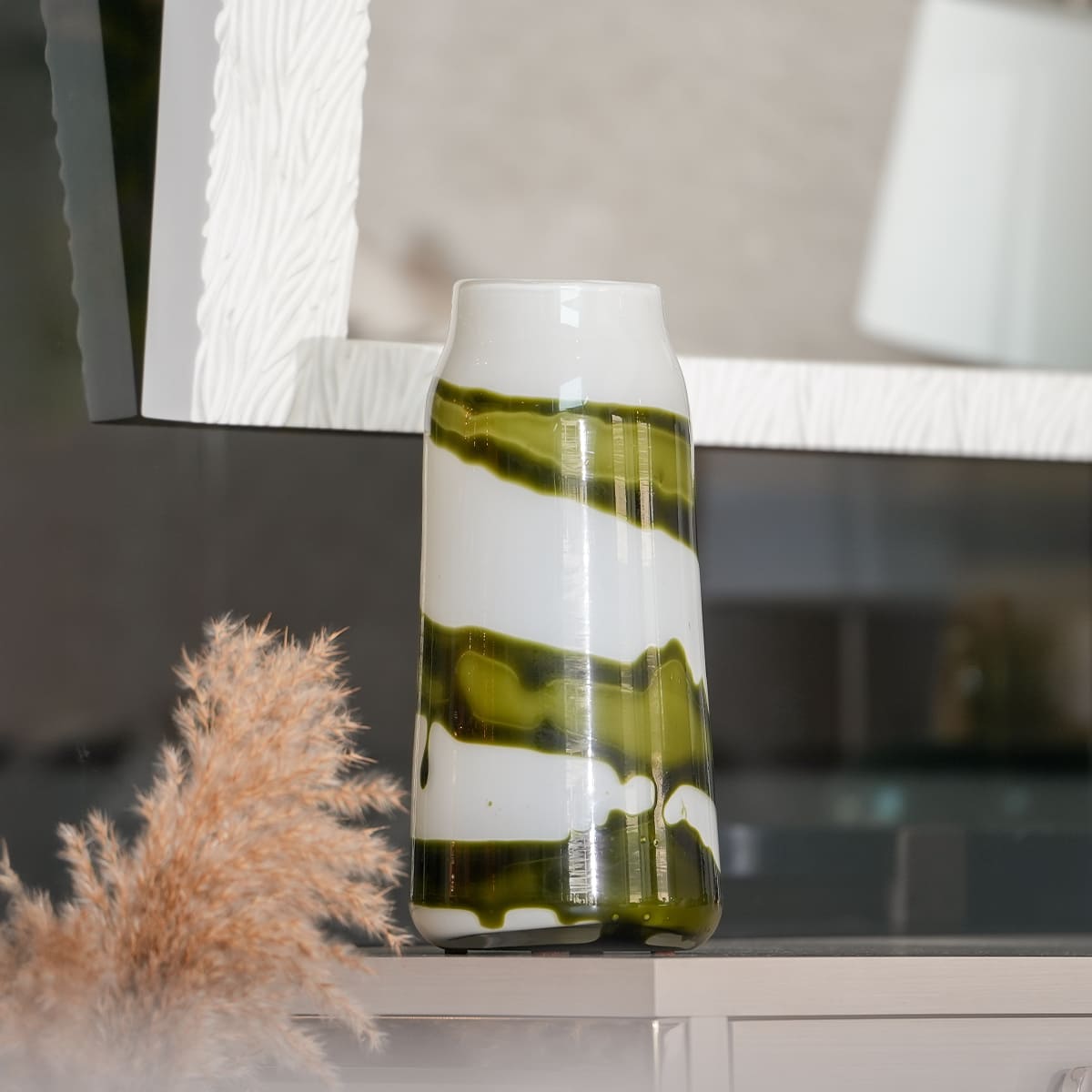 تتميز مزهريات دينالي بزجاج أبيض لؤلؤي متموج، مع طبقات متعددة من درجات اللون الأخضر المضافة بعناية لتشكيل تصميم آسِر. يعمل حرفيان معًا بينما يكون الزجاج لا يزال ساخنًا ومنصهرًا، حيث يقومان بتطبيق كل لون على حدة لابتكار مزيج مذهل من الألوان. كل مزهرية فريدة من نوعها، مع اختلافات طفيفة في اللون والتصميم، ومتوفرة بثلاثة أحجام مختلفة