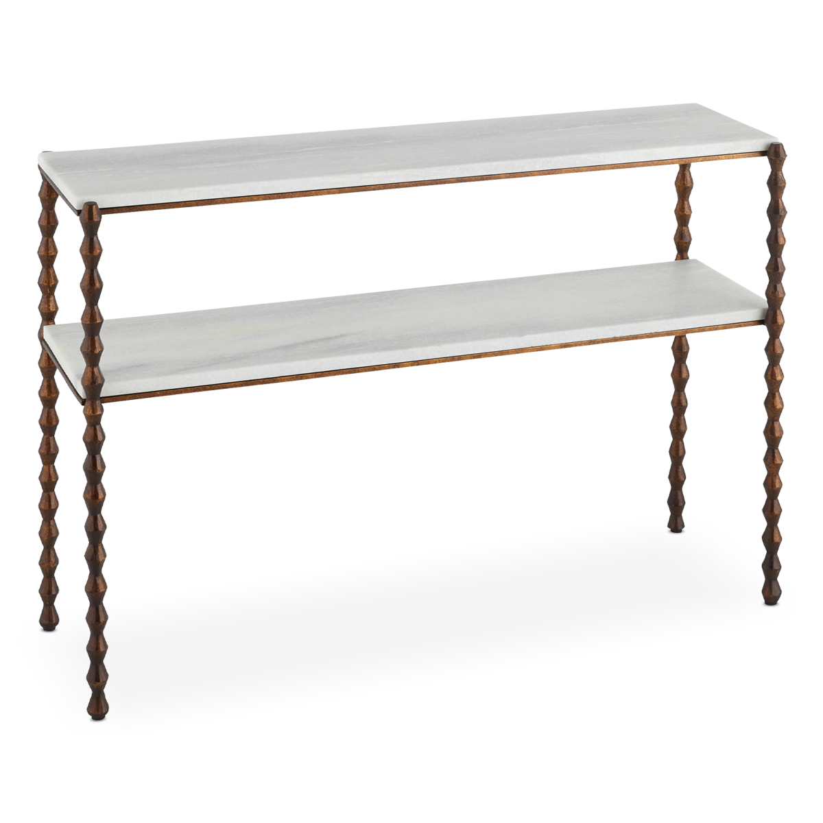 طاولة الكونسول ديامانتي تتميّز بهيكل مصنوع يدويًا من قضبان الحديد المنحوتة بتصميم ماسي مخروطي متكرر بتشطيب من البرونز العتيق.