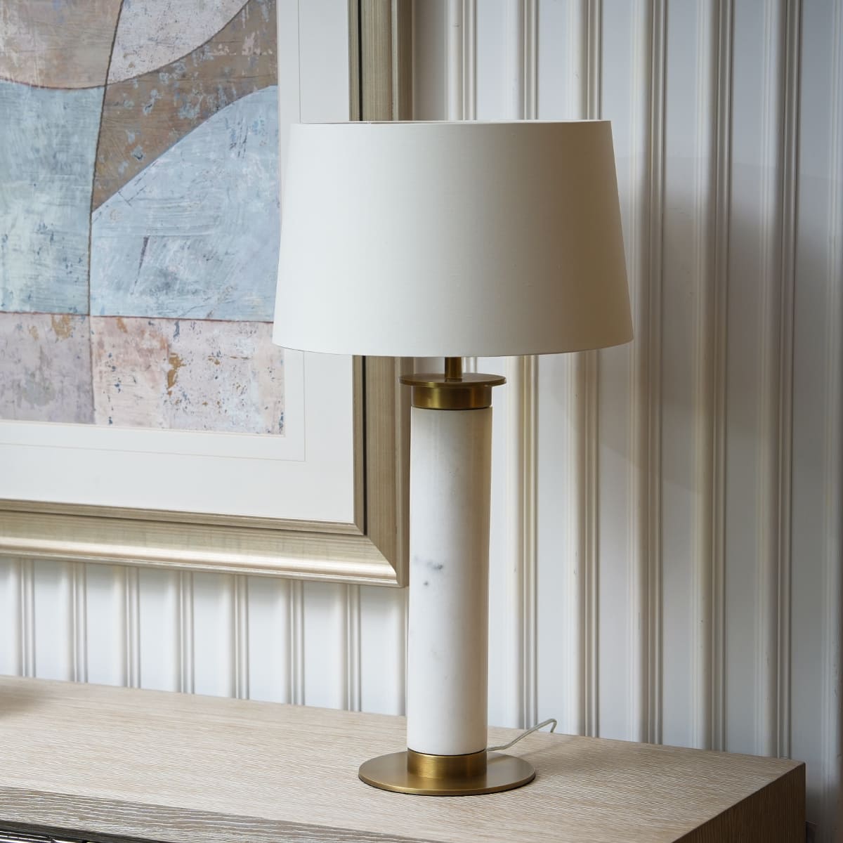 عمود الرخام الأبيض في مصباح الطاولة "استلي دونال" مذهل. تصبح هذه الأسطوانة الرفيعة من الحجر الفخم تصميمًا أنيقًا يتم تعزيزه فقط من خلال التفاصيل النحاسية العتيقة في كلا الطرفين. التنفيذ بسيط، والنتيجة رائعة.