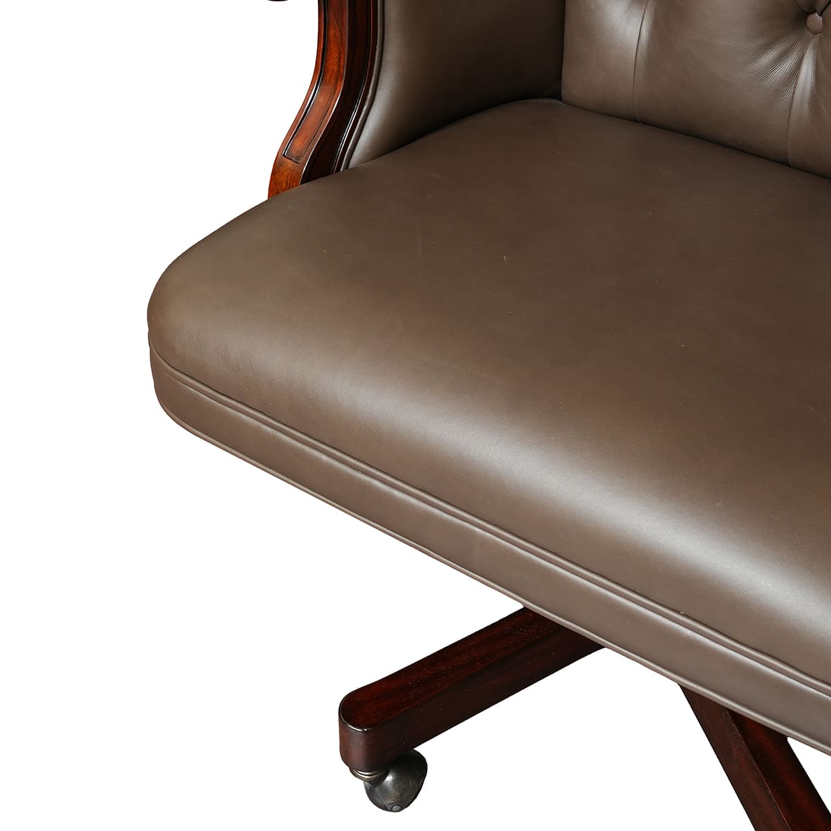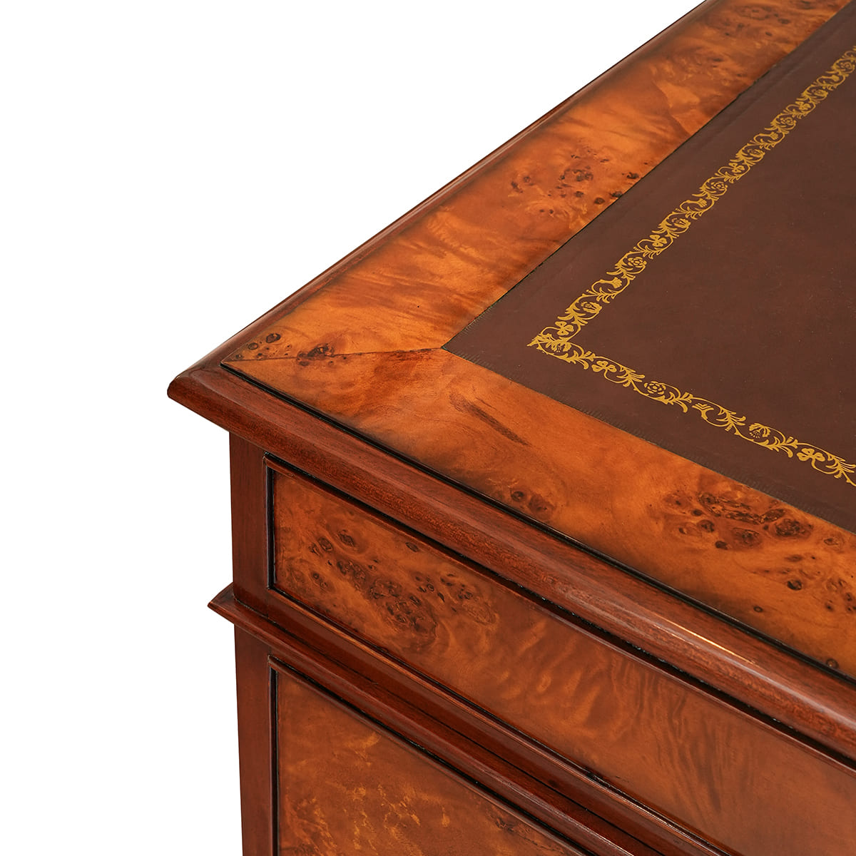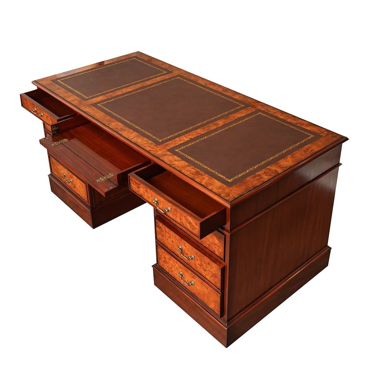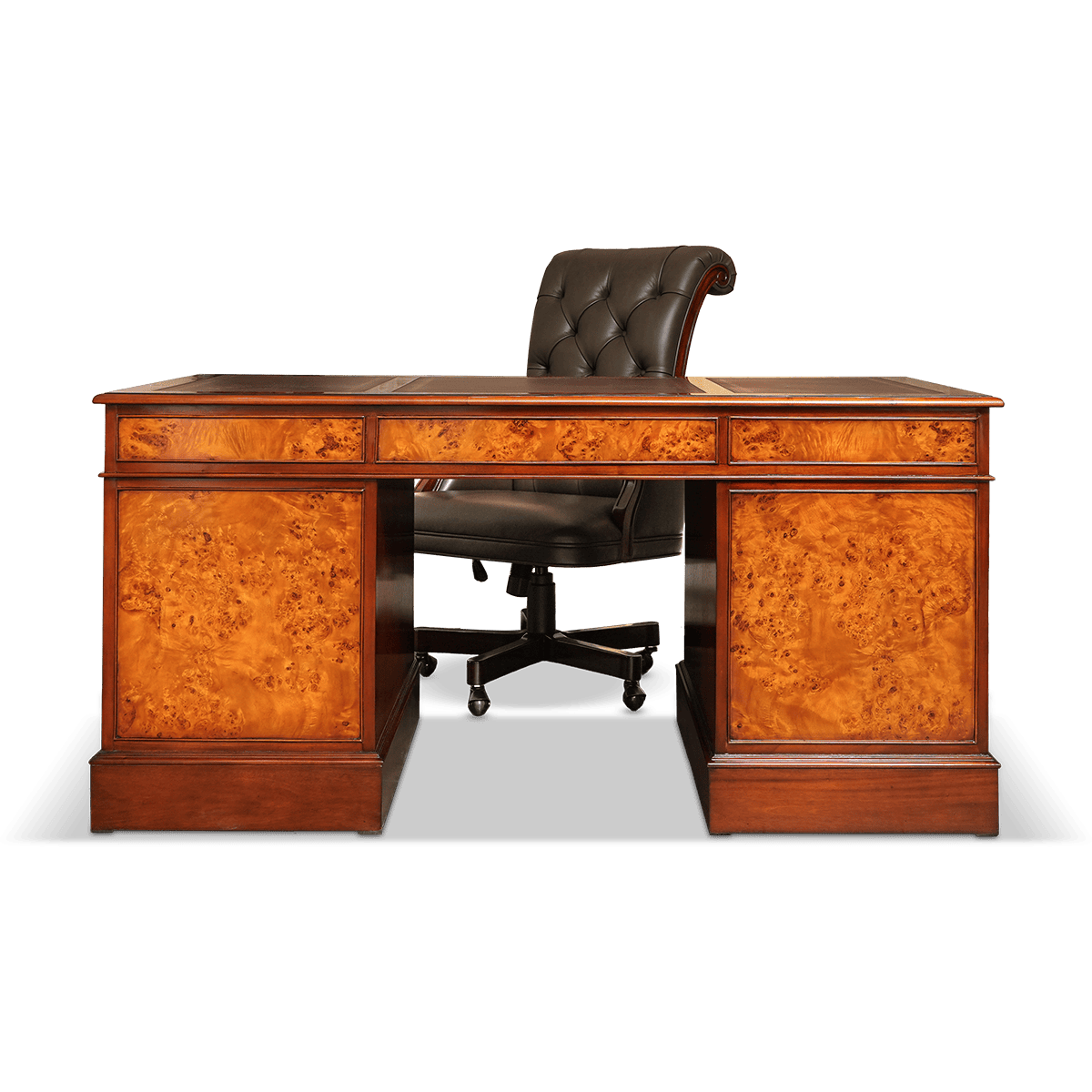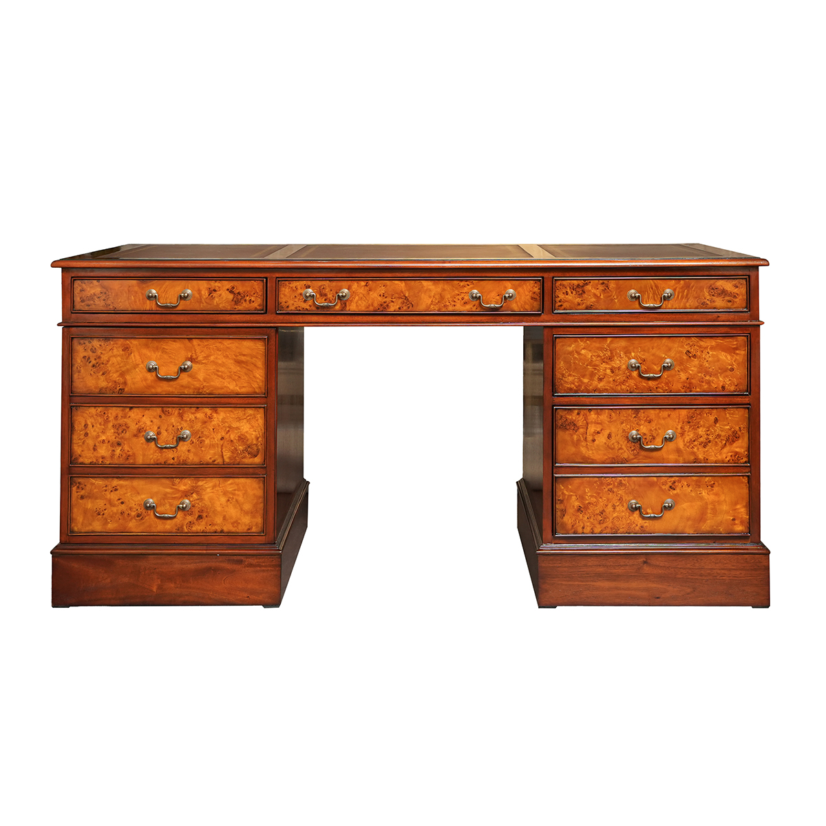 مكتب بيدستال إنجليزي مزود بدرجين للملفات وسطح جلدي، مناسب تماماً للغرف ذات الطابع الكلاسيكي التقليدي كما أنه يضفي حضوراً رائعاً في البيئات العصرية. هذا المكتب المصنوع من خشب البُرْل متوفر مع مجموعة متنوعة من الأسطح الجلدية. يتكون من ثلاث قطع مما يسهل إدخاله حتى إلى المنازل الصغيرة.