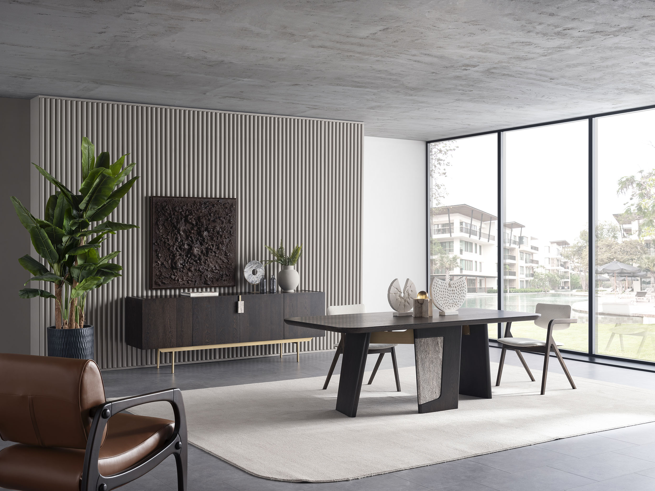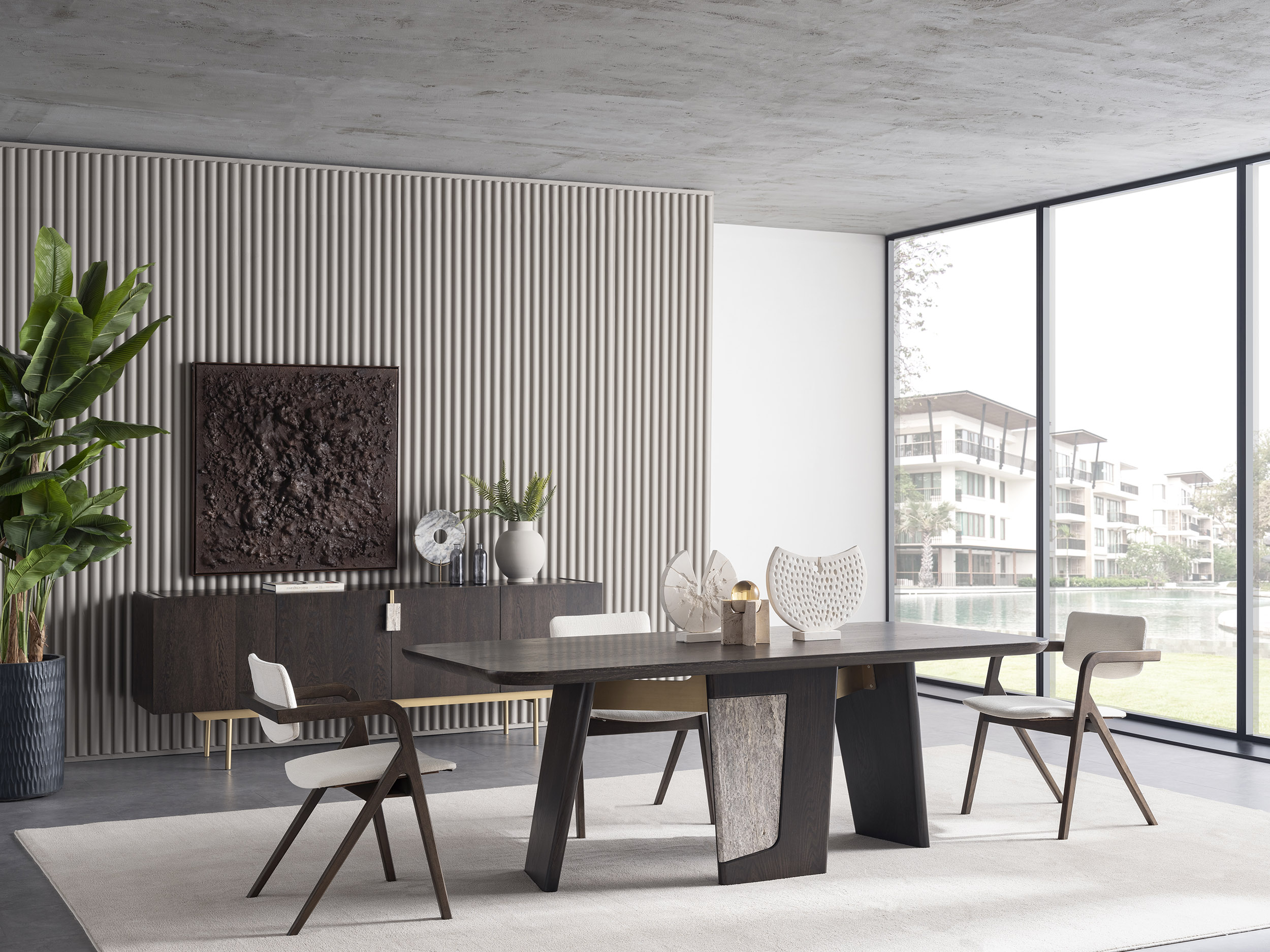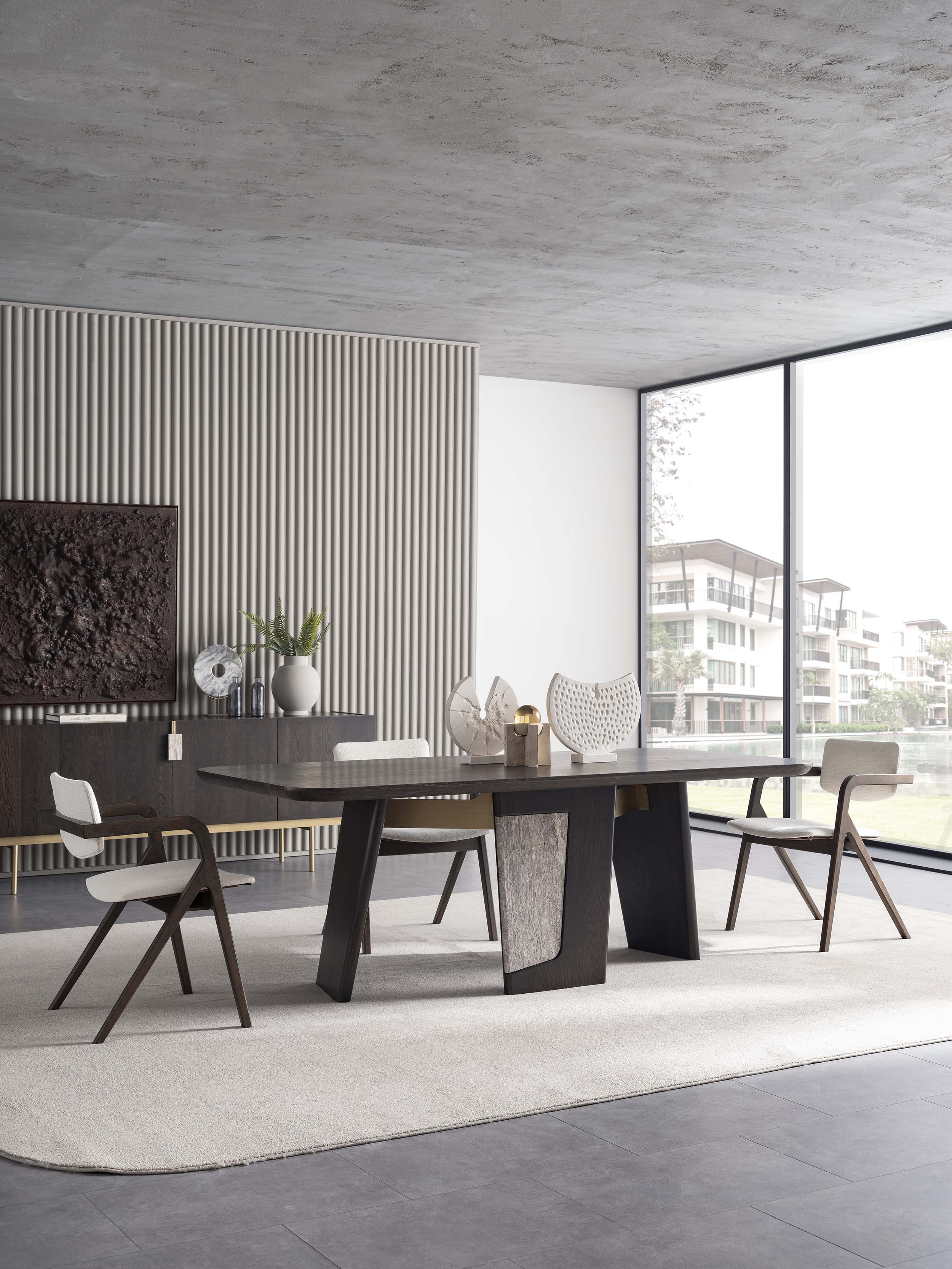طقم طاولة طعام إنزو يجسّد الأناقة المعاصرة من خلال حِرفية متقنة وخيارات تصميم قابلة للتخصيص. يتوفر السطح بأحجام مختارة مع الحفاظ على بنيته المميزة، بينما يظل تصميم القواعد ثابتاً لضمان التوازن البصري. يتيح التصميم مرونة في التشطيبات، مع إمكانية إضافة تفاصيل رخامية ولمسات معدنية باللونين الذهبي أو الأسود، إلى جانب مجموعة من ألوان الكونسيلر وتشطيبات قشرة البلوط المصنوعة يدوياً التي يمكن تطبيقها على السطح والقواعد معاً. يجمع هذا الطقم بين التنوع والخامات الراقية ليقدّم تجربة طعام مُصقَلة تعزز دفء وشخصية المساحات العصرية.