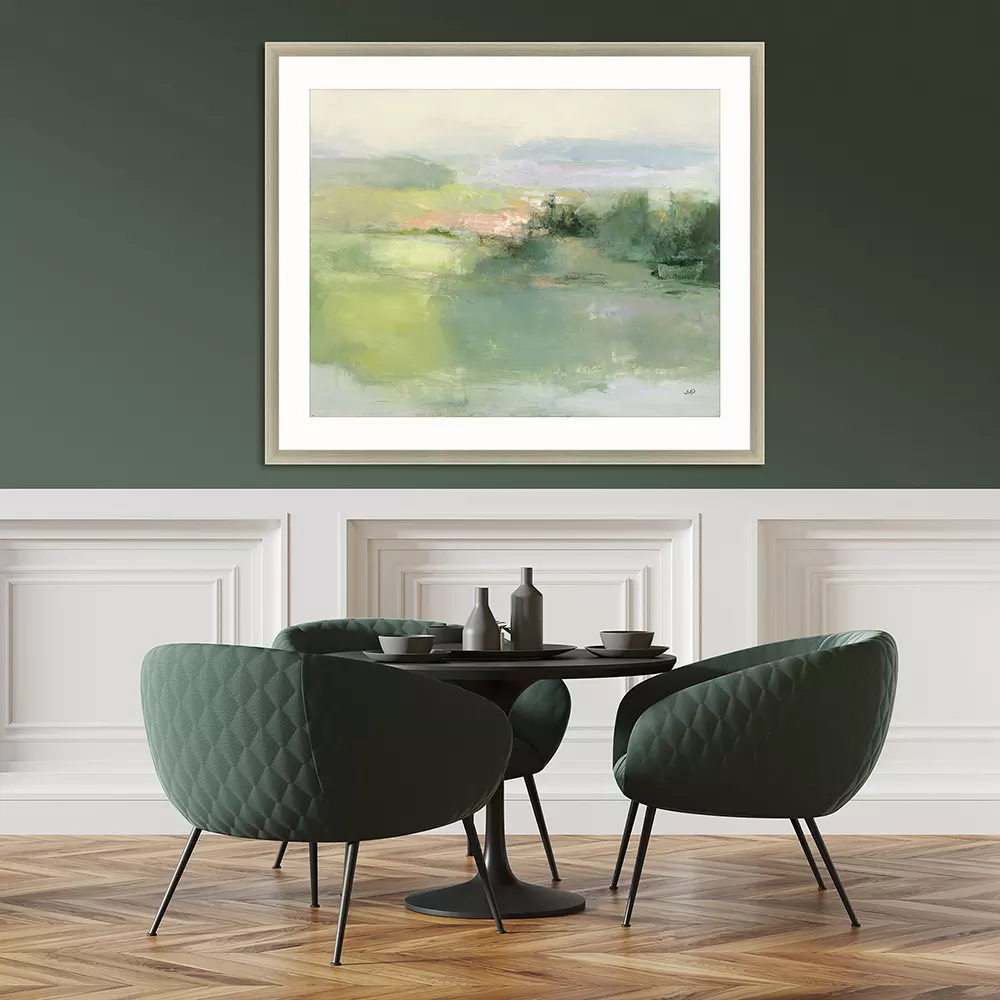 منظر طبيعي متدرج باللونين الأخضر والوردي، مزود بحاشية بيضاء. مؤطر بإطار خشبي فضي عتيق مع لمسات ذهبية شمبانية وحواف سوداء مطلية.