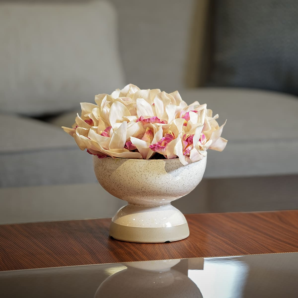 أضف لمسة من الأناقة مع أوركيد سيمبيديوم الأخضر المرتب بأناقة داخل مزهرية زجاجية مع إناء ماء. بارتفاع ٢٣ سم، يُعد هذا التنسيق الصناعي مثالياً لإضفاء إشراقة على المكاتب أو الرفوف أو الزوايا الصغيرة. تفاصيل واقعية وأوراق غنية تمنح مساحتك لمسة خالدة من الجمال، مع بقاء مظهرها متألقاً طوال العام من دون أي عناية.