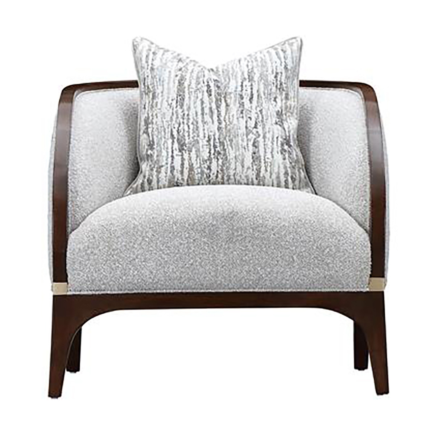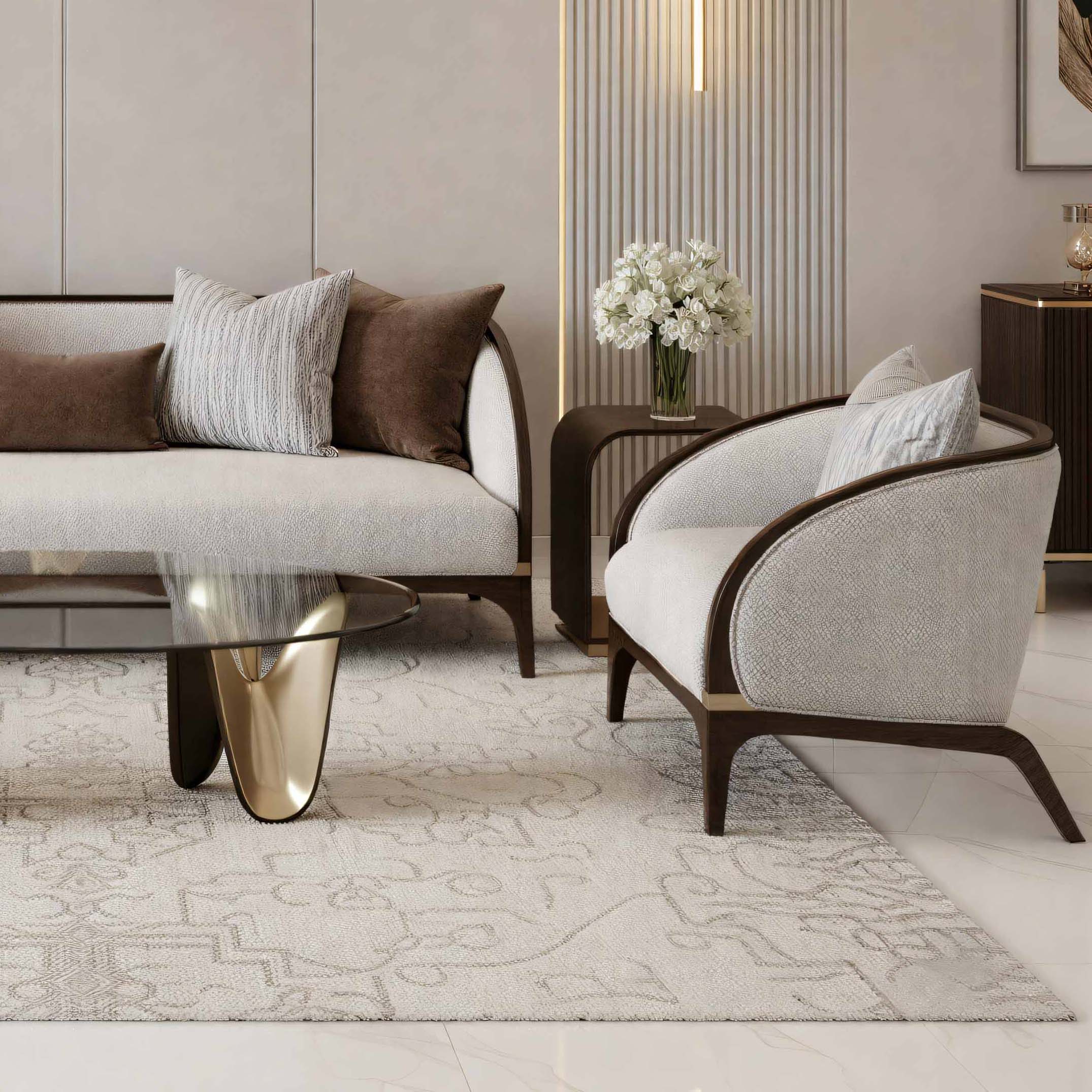 كرسي هيوستن بيبل – مايكل أميني هو كرسي جانبي أنيق يجسد الراحة الراقية والفخامة الخالدة. مُنجّد بقماش بوكليه ممزوج بدرجات ناعمة من الرمادي والعاجي والبيج، ليضفي ملمساً فاخراً وإحساساً دافئاً على المساحة. يكتمل تصميمه بإطار خشبي منحني بتشطيب جوزي دافئ مع لمسات ذهبية مطلية تضيف لمسة بريق مُصقلة. مع وسائد محشوة بالريش تمنح راحة وثرية، يشكل هذا الكرسي توازناً مثالياً بين الأناقة والراحة ليكون إضافة مميزة للمساحات الداخلية الراقية.