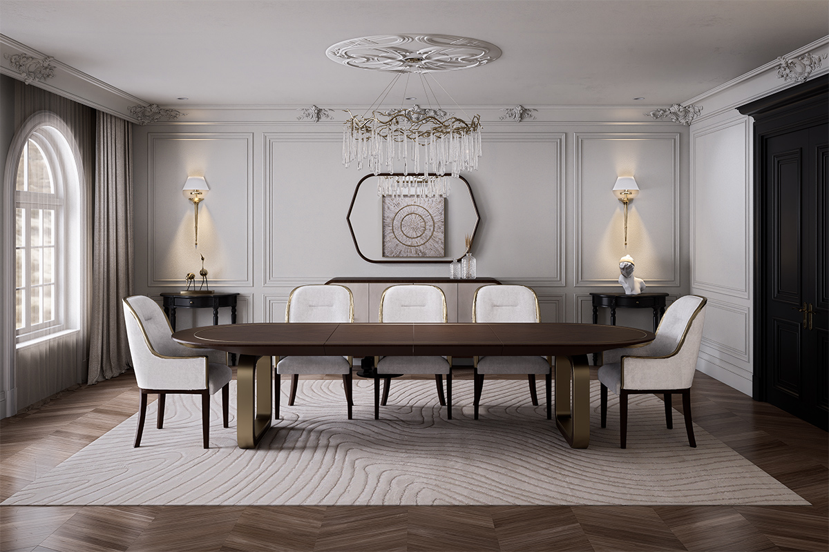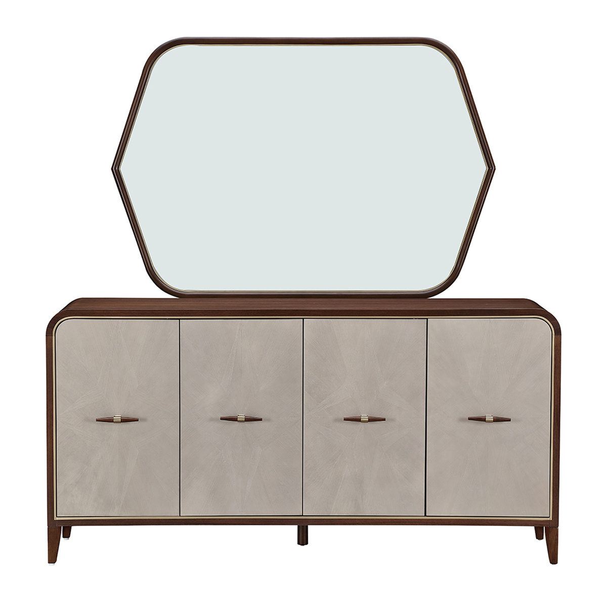 بوفيه ومرآة هيوستن هما مجموعة راقية تجمع بين الأناقة العصرية والوظيفة العملية. يتميز البوفيه بإطار بتشطيب جوزي غني مع واجهات أبواب رمادية متباينة مزينة بنقشة نجميّة دقيقة وملمس ناعم، بينما يبرز الإطار الذهبي الأنيق انسيابية التصميم. تضيف المقابض المخروطية المصنوعة من مزيج الخشب والمعدن لمسة عصرية مُصقلة مع توفير مساحة تخزين واسعة ومنظمة. وتكمل المرآة الجدارية التصميم بشكل نحتي متعدد الأضلاع بحواف مستديرة ناعمة، مؤطرة بخشب الجوز مع حدود ذهبية رقيقة، لتمنح المساحة عمقاً ودفئاً وفخامة هادئة في غرف الطعام أو المعيشة.
