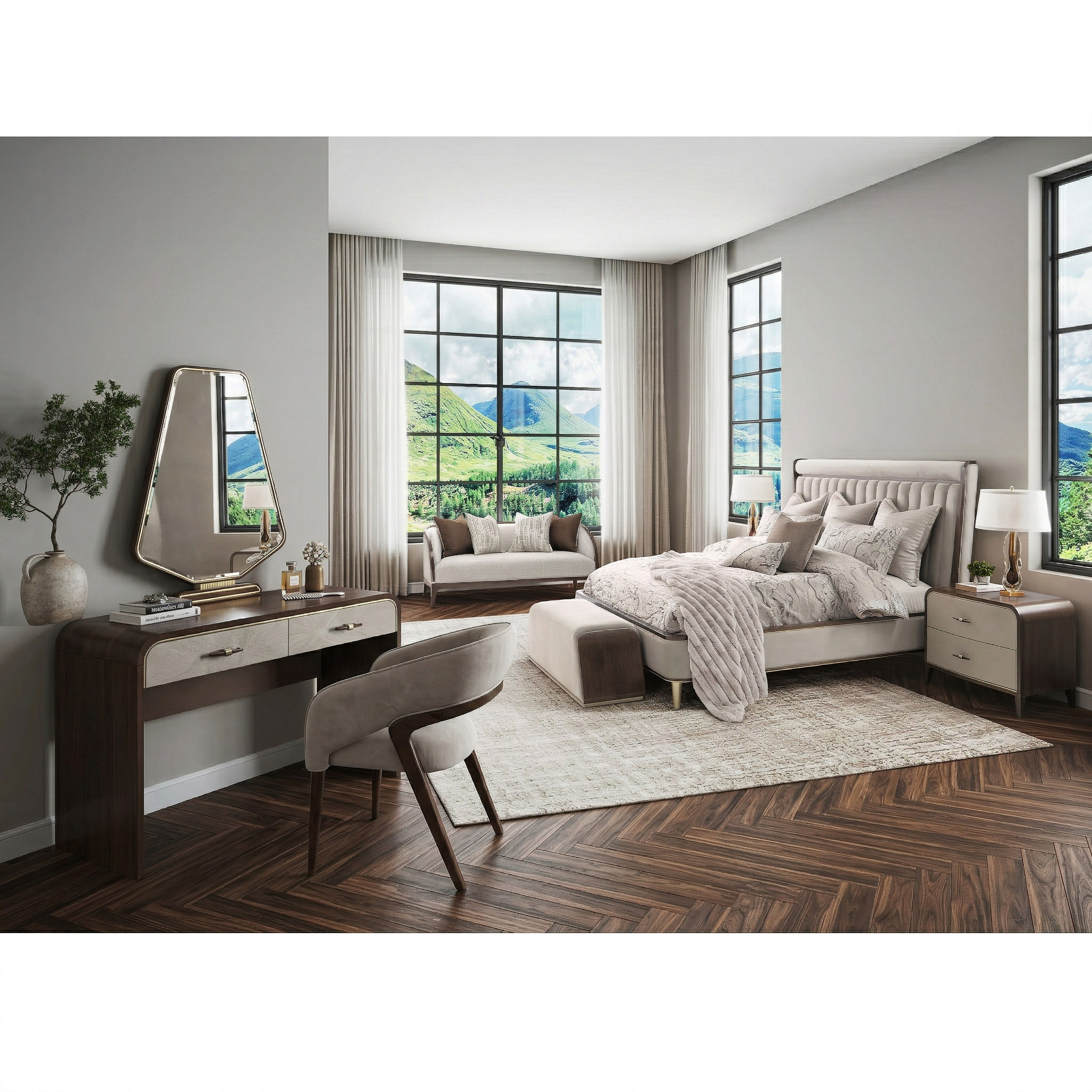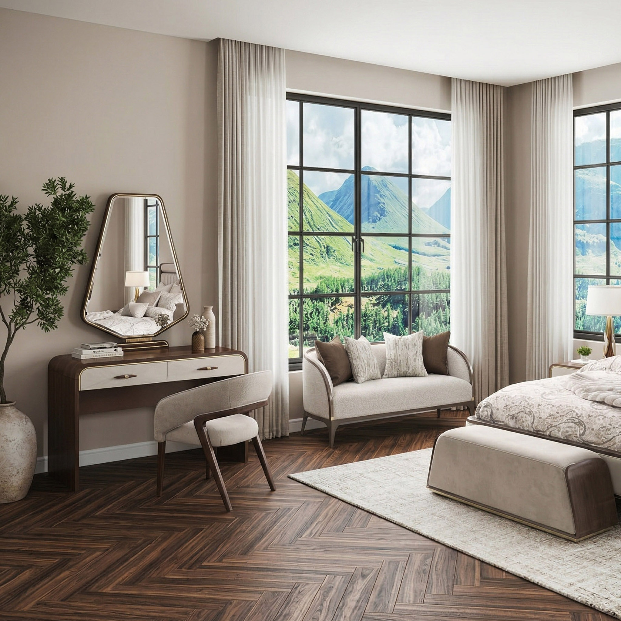 يمزج مكتب التسريحة هوستن بين الأناقة العصرية والوظائف المتعددة بتصميم يجسّد الرقي بسلاسة. يتميّز بإطار بتشطيب من خشب الجوز الدافئ، مع واجهات أدراج رمادية محبوكة بنقش شعاعي ناعم وتفاصيل مذهّبة أنيقة. يحتوي على درجين مبطّنين بالمخمل بنظام إغلاق ناعم لتخزين راقٍ ومنظّم. يمكن استخدامه كتسريحة أنيقة لمحطة التجميل أو كمكتب كتابة عصري، ليجمع بين العملية والفخامة في آنٍ واحد