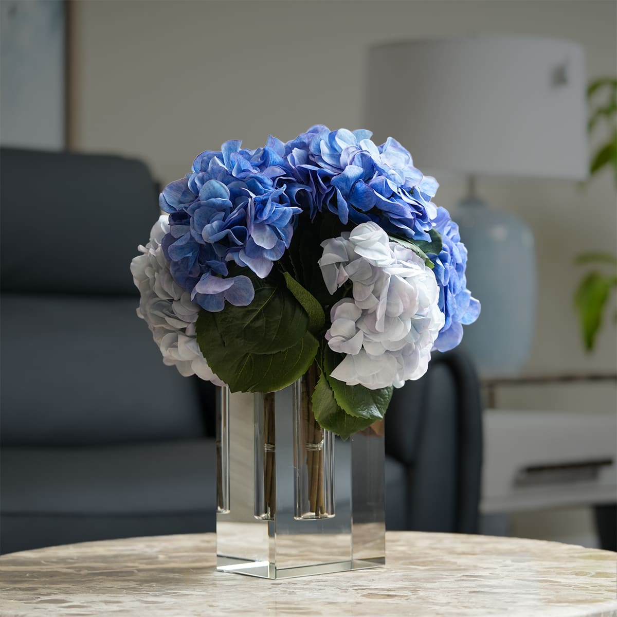 أضف أجواء من الفخامة مع الهدرانجيا الزرقاء الموضوعة داخل مزهرية زجاجية أنيقة. بارتفاع ٤٦ سم، يمنحك هذا التنسيق حضوراً لافتاً يجمع بين الأناقة والجاذبية، وينسجم بسلاسة مع ديكور المواسم أو الاستخدام على مدار العام. تأمل روعة الأزهار الصناعية بتفاصيلها الواقعية وأوراقها الغنية، لتمنح منزلك لمسة خالدة من التميز. تأتي باقات "دروب إن" في الوعاء كما هو موضح، من دون مادة الأكريليك، لتمنحك حرية التخصيص وتبديل الأزهار المفضلة لديك بسهولة على مدار العام.