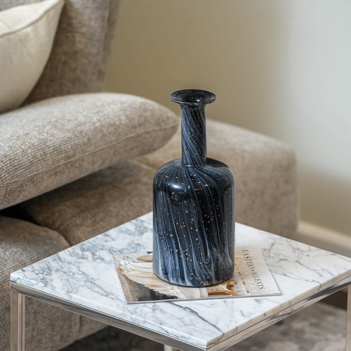 تتميز مزهريات إنفينيتي بتموجات درامية من الأسود والرمادي مع نثرات ذهبية، تُبرز الطبقات المتداخلة لزجاج الجرانيلا المنفوخ يدويًا. يكمّل شكلها الأنيق الشبيه بزجاجة ذات عنق طويل وحافة مسطّحة الأنماط الفريدة التي تتشكل أثناء عملية نفخ الزجاج، في احتفاء بإبداع هذا الفن العريق. متوفرة بثلاثة أحجام منفصلة.