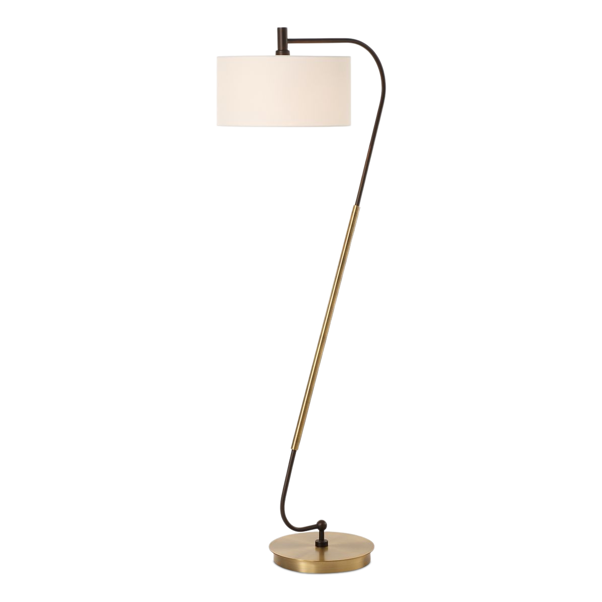 يتميز هذا المصباح الأرضي المقوّس بتصميم أنيق مصنوع من الفولاذ، مع تشطيب نحاسي معتّق ينسجم مع تفاصيل برونزية داكنة ذات طابع ريفي. يتدلّى الغطاء الأسطواني الصلب المغطّى بقماش كتان أبيض ليمنح إضاءة راقية ولمسة فخمة تضيف جمالًا متوازنًا لأي غرفة.