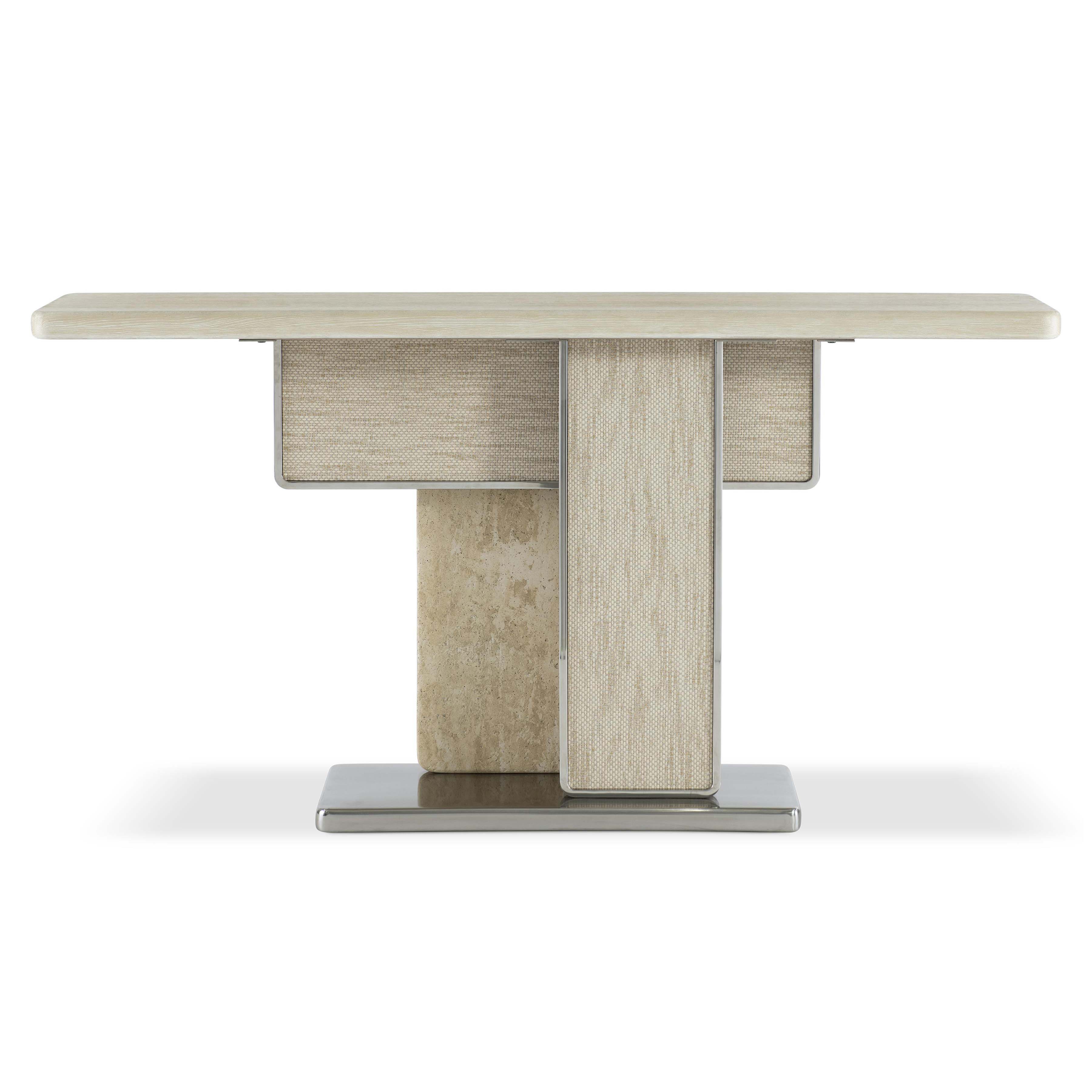 طاولة كونسول لارين تقدم توازناً مثالياً بين الشكل والخامات ضمن تصميم عصري أنيق. يتميز السطح العلوي الخشبي بتشطيب إكرو، ويرتكز على ثلاث ألواح متناسقة، حيث يأتي لوحان بتصميم منسوج محاط بإطارات من الفولاذ المقاوم للصدأ، بينما صُمم اللوح الثالث من حجر صناعي بتشطيب ألبسنت. تستند القاعدة بالكامل على لوح من الفولاذ المقاوم للصدأ ليمنحها حضوراً قوياً ولمسة راقية.