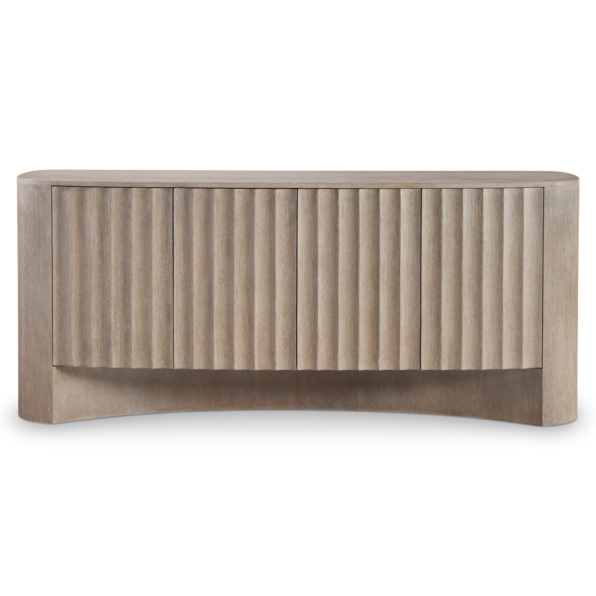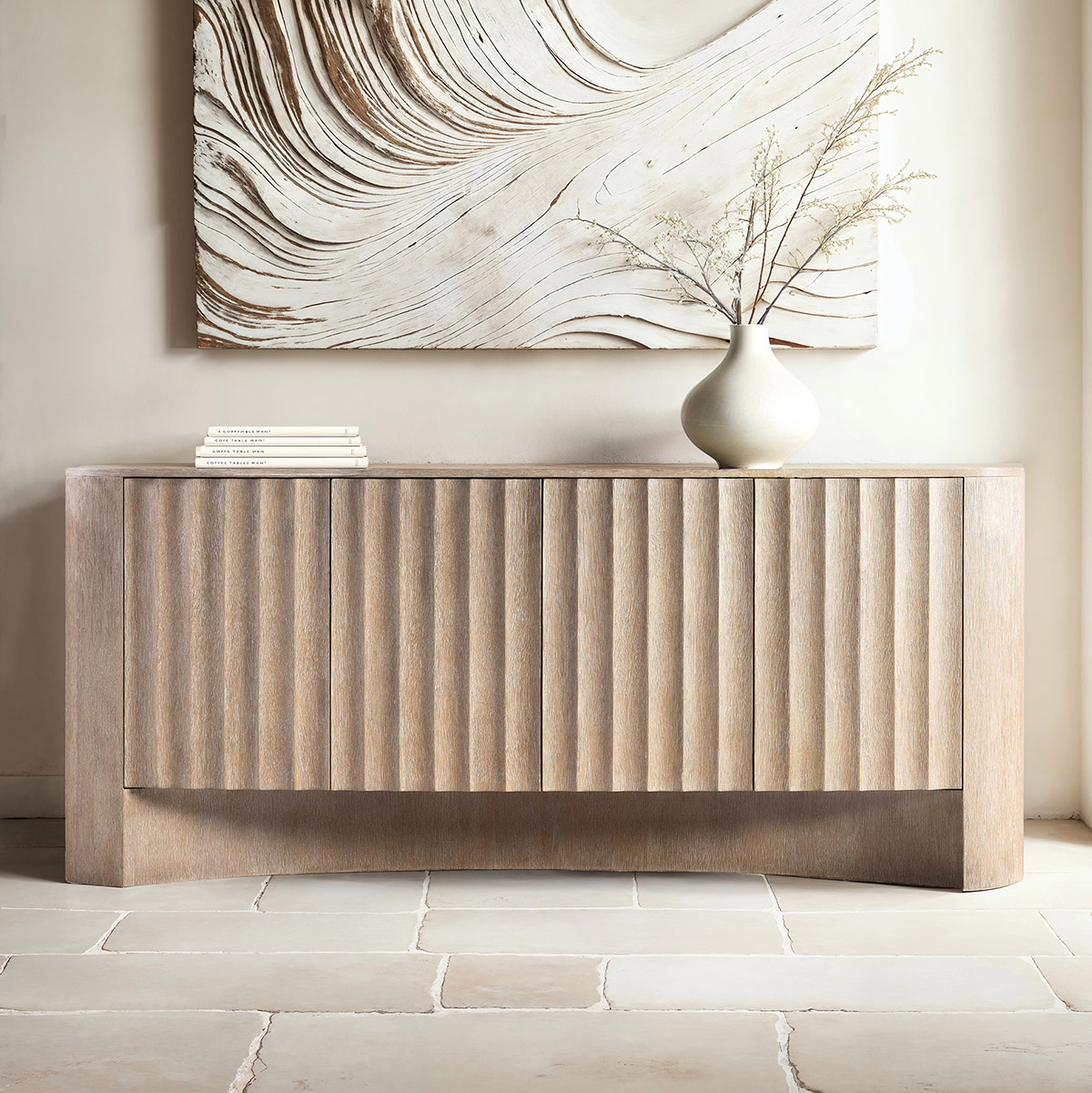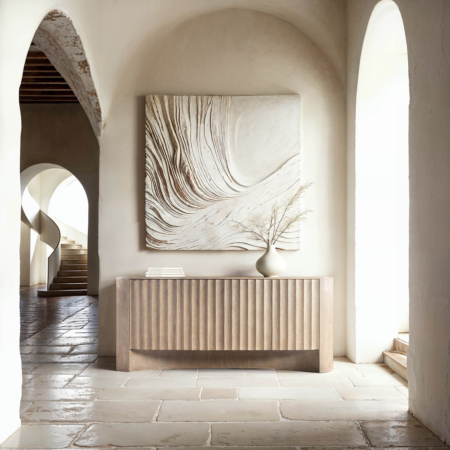 تقدّم خزانة لوغيا الترفيهية تصميماً آسراً يرتكز على تفاصيل معمارية دقيقة بتشطيب آريا الحيادي الناعم، حيث تتكون واجهتها من ثلاثة أبواب تُفتح بالضغط وتتميّز بخطوط مخددة عصرية، بينما يمنحها الهيكل السفلي ذو الانحناءة المقعّرة حضوراً هندسياً يوازن العمق والجمالية. وعند فتح الأبواب، تكشف الخزانة عن رفّين قابلين للتعديل ورف ثابت بالإضافة إلى درج يُفتح بالسحب مع إغلاق ناعم، إلى جانب فتحات ومنافذ مخصّصة لتمرير الأسلاك وتنظيم أجهزة الترفيه، مما يجعلها قطعة تجمع بين الجمال العملي والأناقة الهادئة في أي مساحة معيشة.