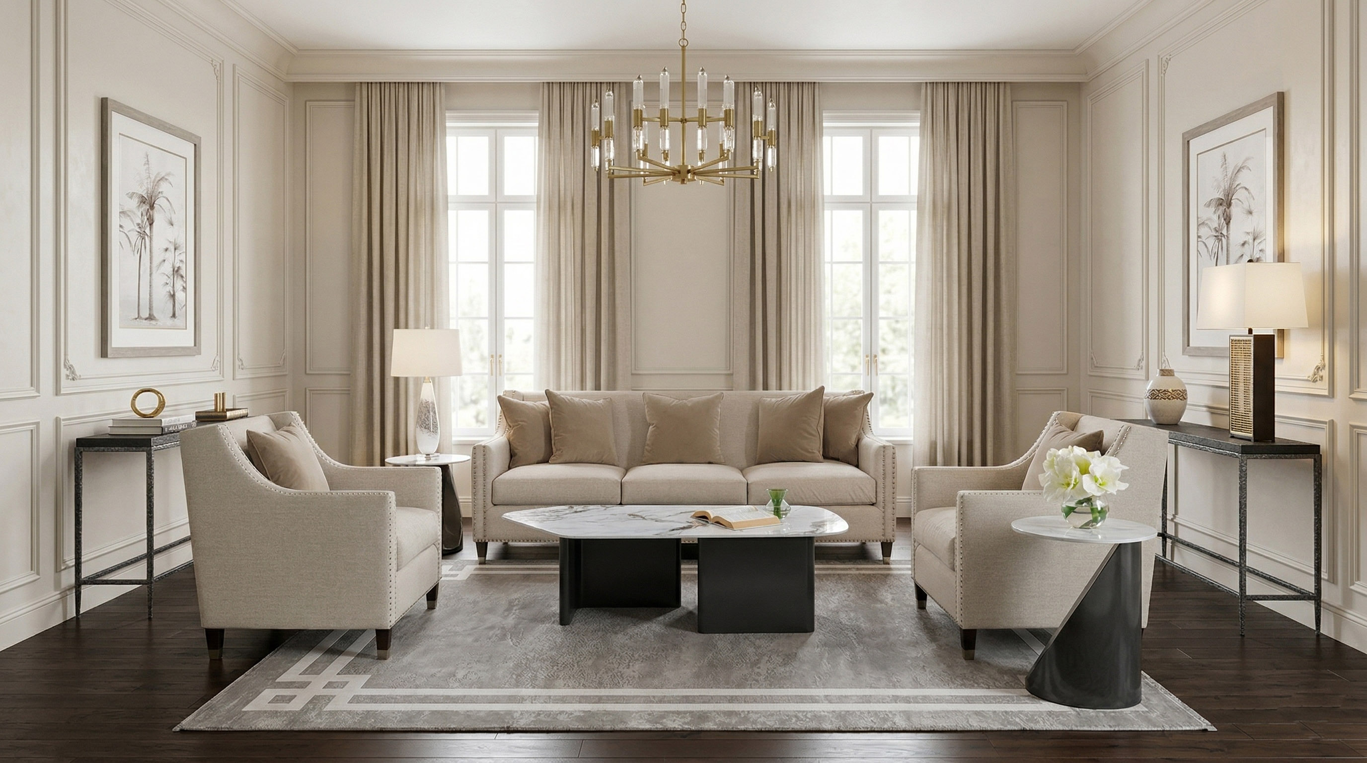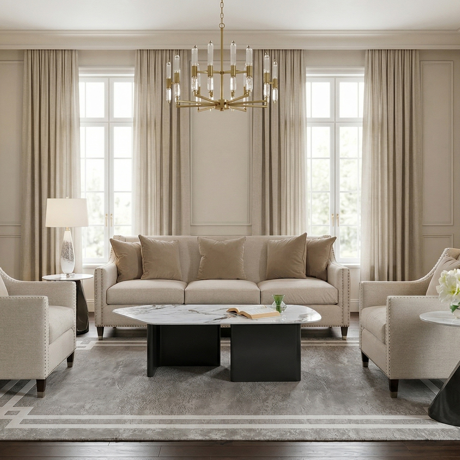 طقم الأريكة لويس يجمع بين الأناقة والراحة، ويتميز بلمسة نهائية فضية بلون الشامبانيا تضيف لمسة من الرقي إلى أي مساحة. مصنوع من خشب البتولا المتين لضمان الثبات والاستدامة، ويحتوي على رغوة عالية الكثافة توفر راحة فائقة ودعماً مثالياً. مُغطى بمزيج فاخر من قماش البوليستر والمخمل، مما يمنح الطقم ملمسًا ناعمًا وإحساسًا دافئًا مع طابع أنيق—مثالي للديكورات الداخلية العصرية والأنيقة
