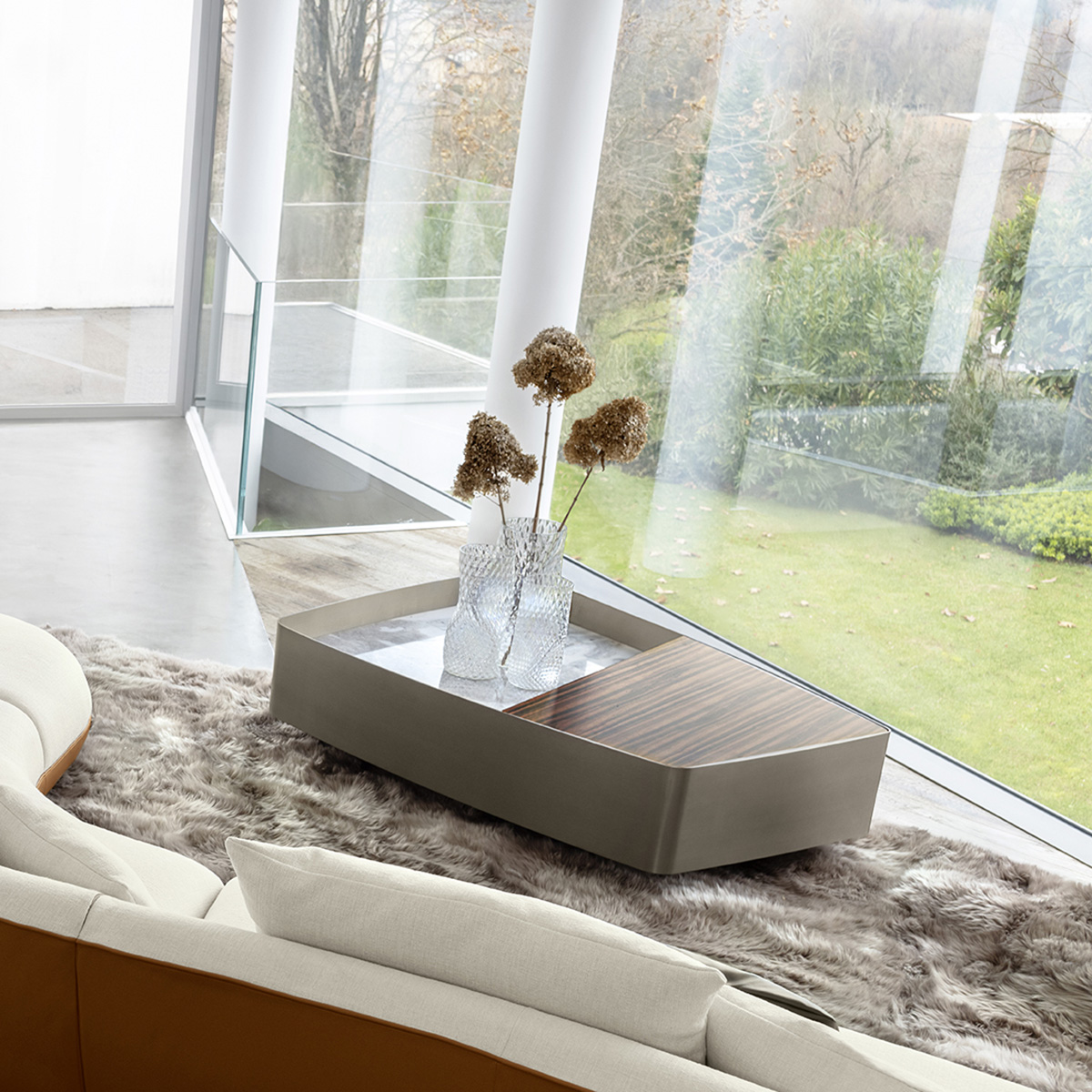 طاولة وسط مستطيلة لوكسور – جورجيو كوليكشن هي قطعة محورية فاخرة تجسد الحداثة الراقية والحرفية المتقنة. صُممت بهيكل من الفولاذ المقاوم للصدأ بتشطيب تيتانيوم مجلفن ساتاني، وتتميز بسطحين متدرجين يجمعان بين قشرة خشب ماكاسار إيبوني الساتانية ورخام ناميبيان أويستر عالي اللمعان. يخلق التناغم بين عروق الخشب الغنية وبريق الرخام والتفاصيل المعدنية الأنيقة تبايناً بصرياً فاخراً يعزز أناقة المساحات المعيشية العصرية ويمنحها حضوراً معمارياً مُصقلاً.