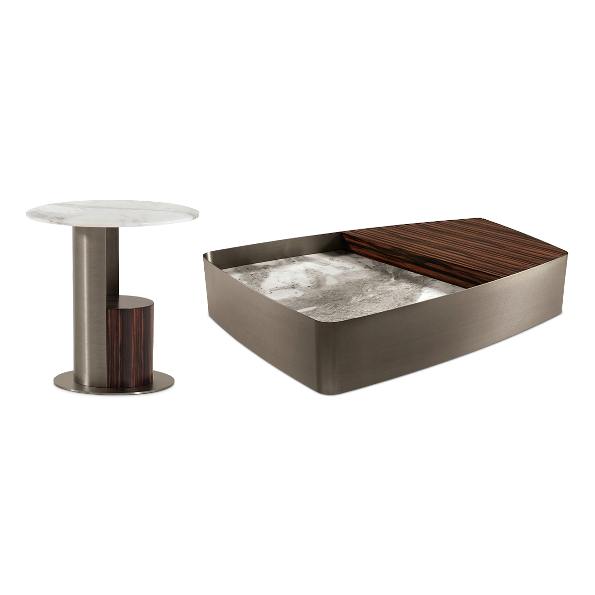 طاولة وسط مستطيلة بإطار من الفولاذ المقاوم للصدأ المصقول بطبقة تيتانيوم مجلفنة. السطح مكون من مستويين متداخلين يجمعان بين قشرة خشب الماكاسار إيبوني المصقولة وطاولة رخام نيمبيان أويستر بلمعان عالي. طاولة جانبية بسطح مائل من رخام نيمبيان أويستر بلمعان عالي. القاعدة مزيج من قشرة خشب الماكاسار إيبوني المصقولة والفولاذ المقاوم للصدأ المصقول بطبقة تيتانيوم مجلفنة، مع شعارين محفورين بالليزر لمجموعة جورجيو.
