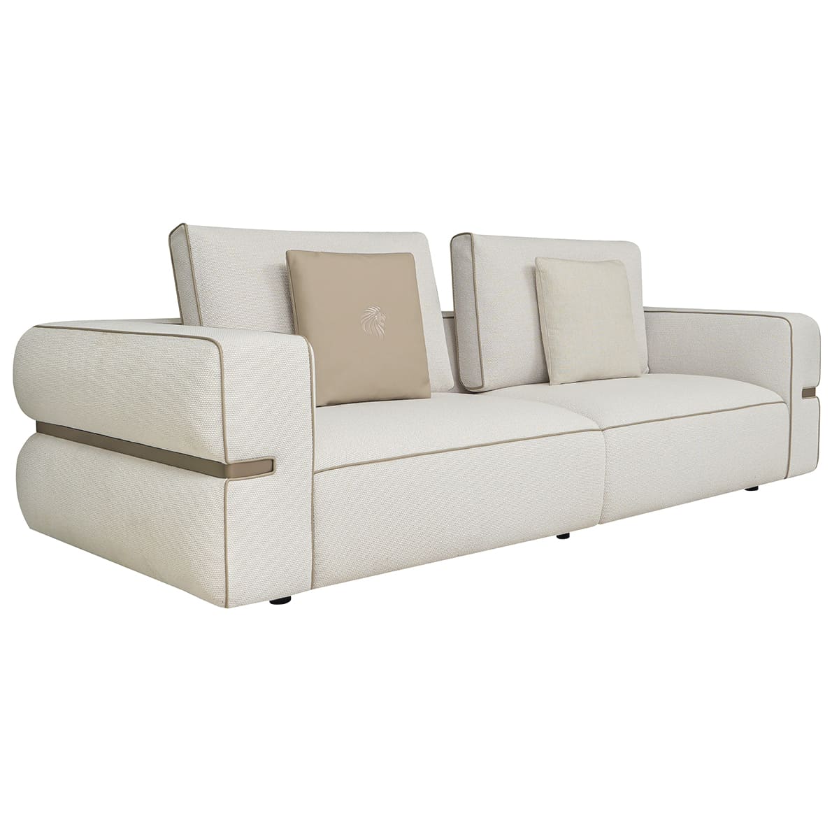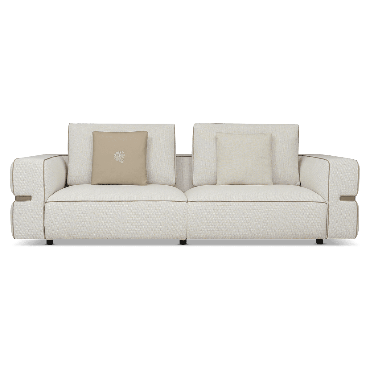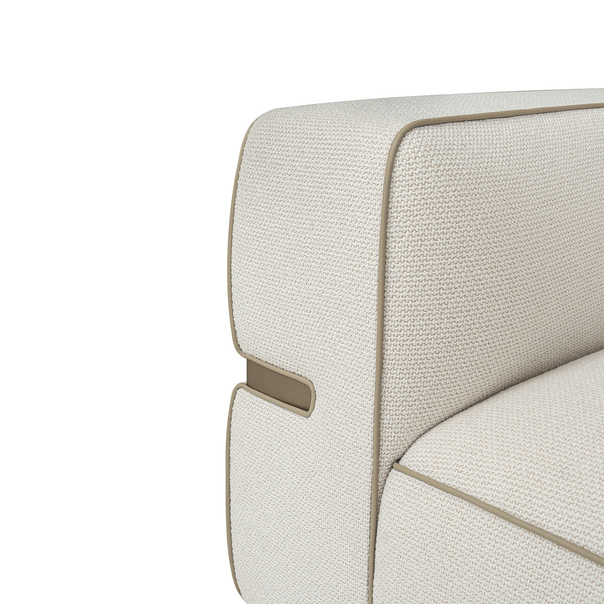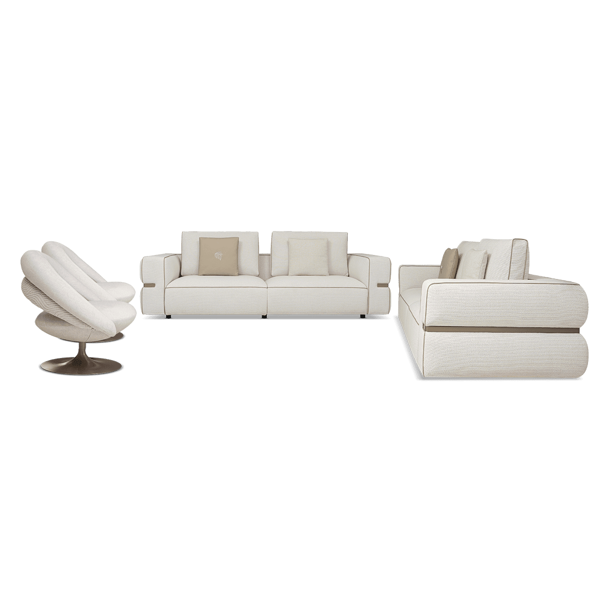 الأريكة متوفرة بالقماش. مقاعد الأريكة وجوانبها بتطريز خاص على رغوة البولي يوريثان ملفوفة بريش الطيور. الحشوات الخلفية والجوانب مصنوعة من الفولاذ المقاوم للصدأ المطلي بطبقة تيتانيوم مجلفنة ومصقولة. ارتفاع المقعد 43 سم. كرسي عرضي بهيكل من الألمنيوم ومتوفّر بالقماش. مقعد الكرسي وجوانبه بخياطة مزدوجة على رغوة البولي يوريثان ملفوفة بريش الطيور. الظهر مزود بوسادتين أسطوانيتين، الوسادة السفلية بتشطيب مبطّن. القاعدة مصنوعة من الفولاذ المقاوم للصدأ المطلي بطبقة تيتانيوم مجلفنة ومصقولة. ارتفاع المقعد 43 سم.