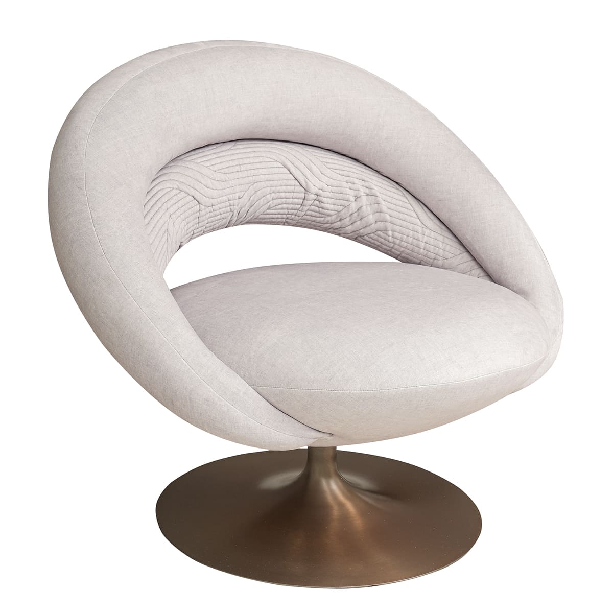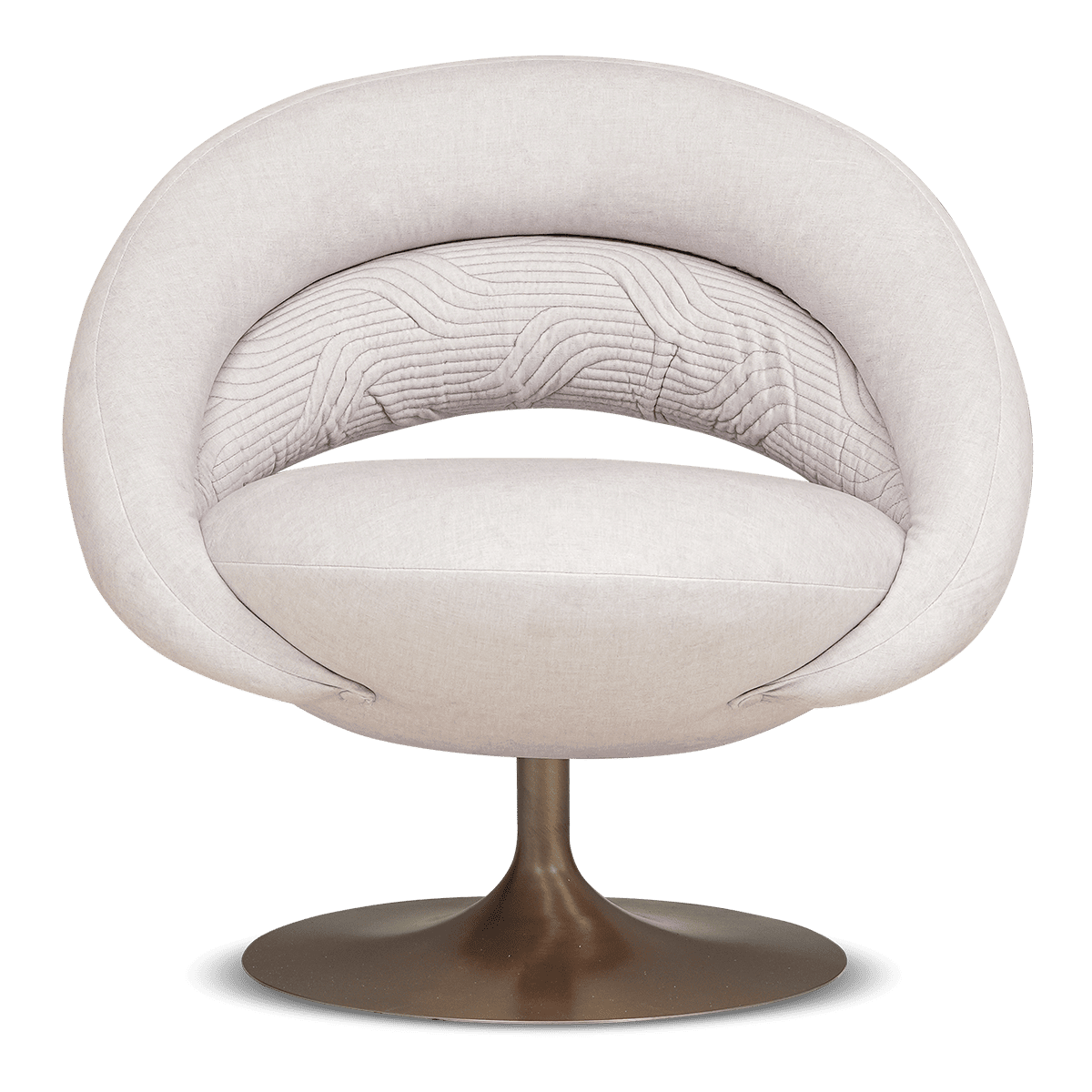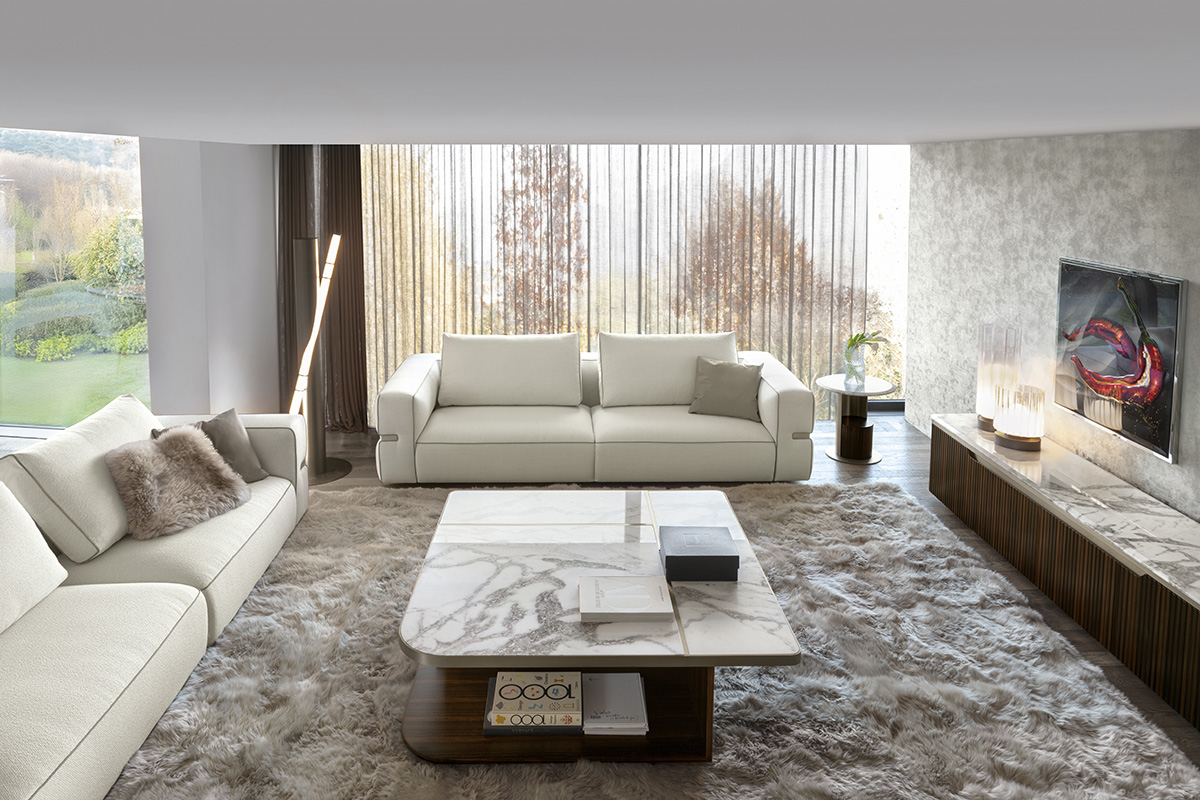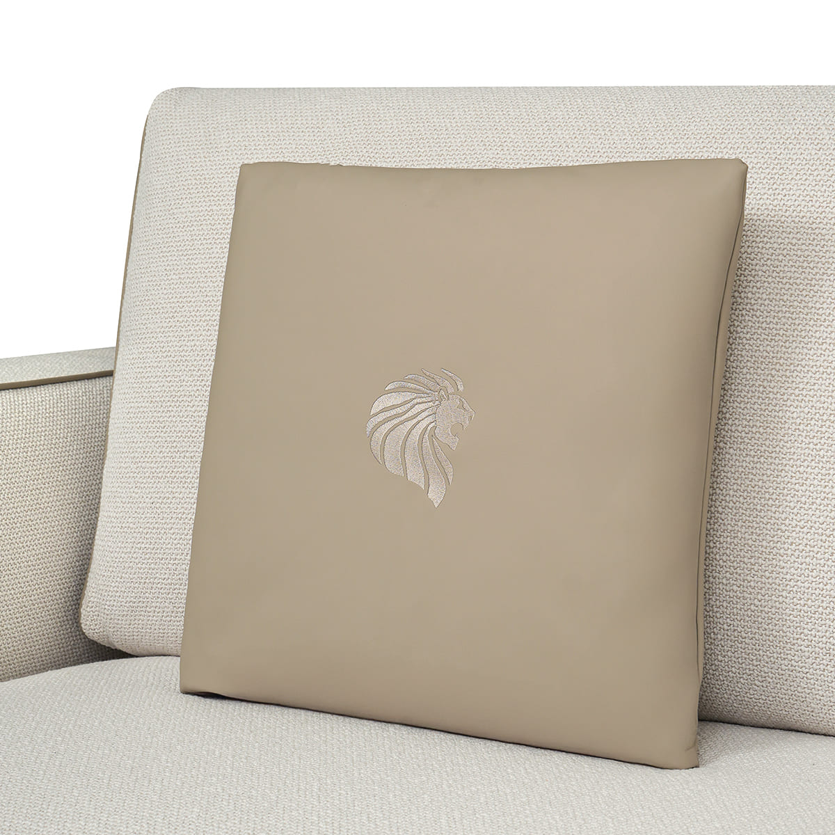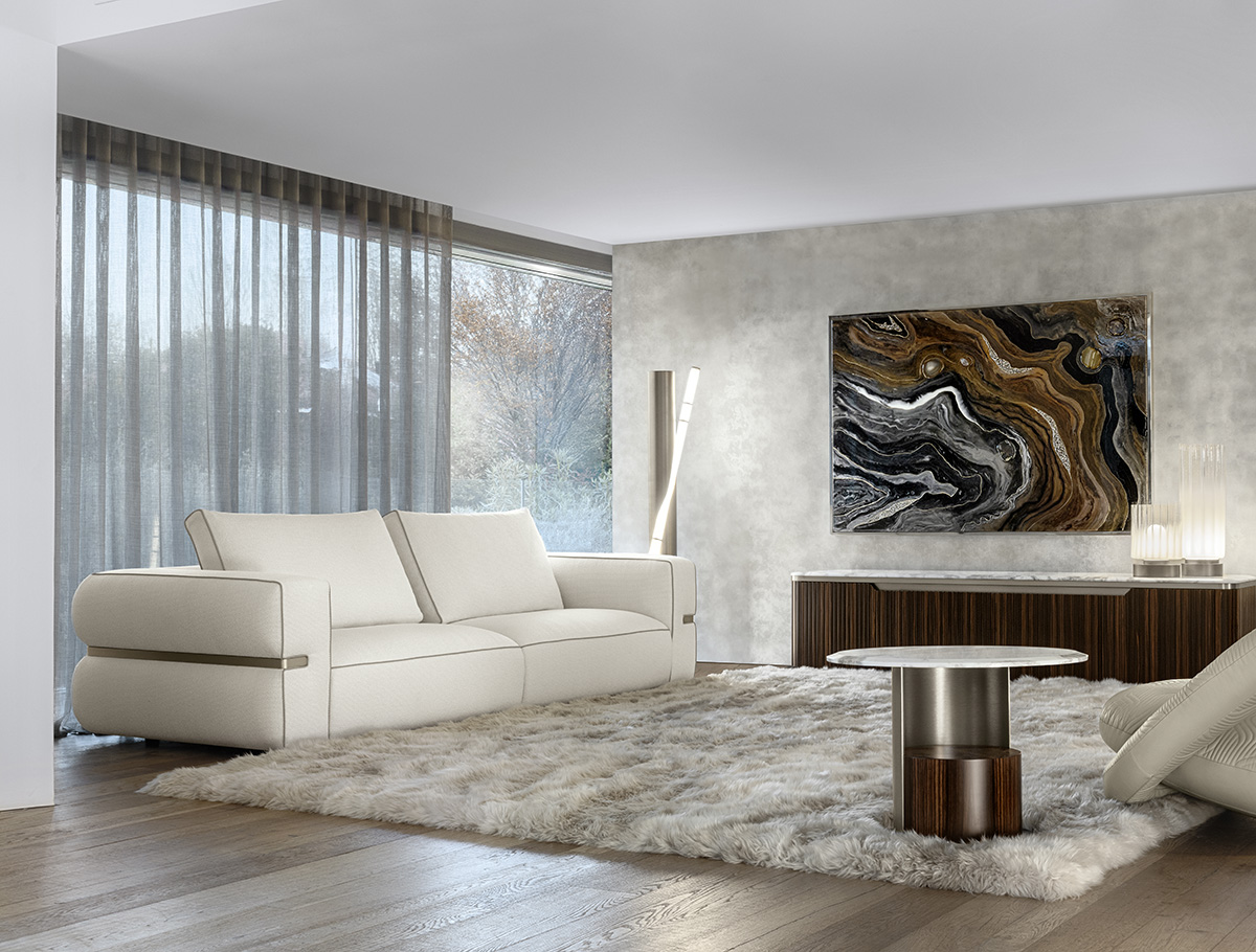 الأريكة متوفرة بالقماش. مقاعد الأريكة وجوانبها بتطريز خاص على رغوة البولي يوريثان ملفوفة بريش الطيور. الحشوات الخلفية والجوانب مصنوعة من الفولاذ المقاوم للصدأ المطلي بطبقة تيتانيوم مجلفنة ومصقولة. ارتفاع المقعد 43 سم. كرسي عرضي بهيكل من الألمنيوم ومتوفّر بالقماش. مقعد الكرسي وجوانبه بخياطة مزدوجة على رغوة البولي يوريثان ملفوفة بريش الطيور. الظهر مزود بوسادتين أسطوانيتين، الوسادة السفلية بتشطيب مبطّن. القاعدة مصنوعة من الفولاذ المقاوم للصدأ المطلي بطبقة تيتانيوم مجلفنة ومصقولة. ارتفاع المقعد 43 سم.