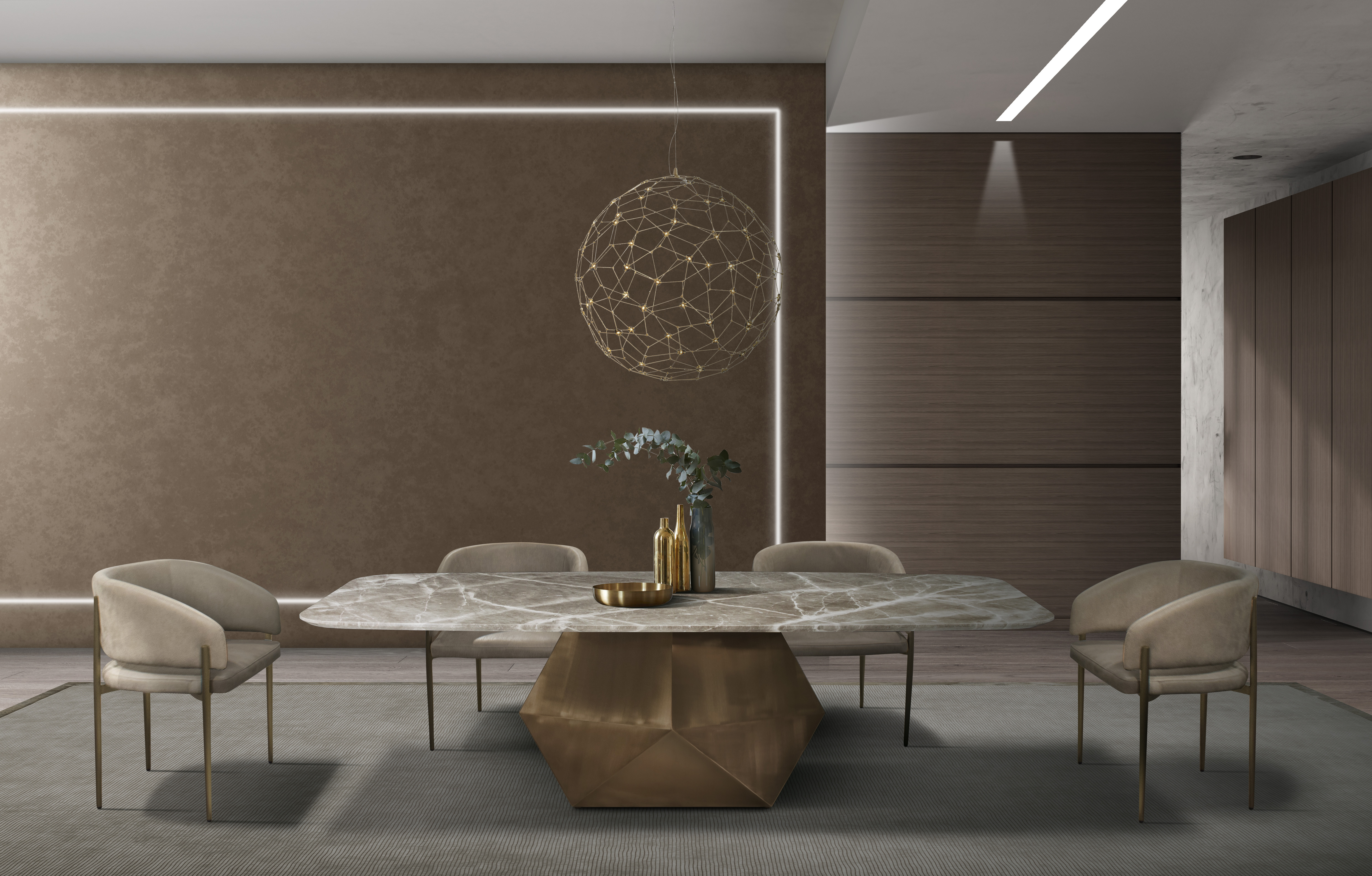 تُعد طاولة الطعام المستطيلة MAESTRO تحفة فنية في عالم التصميم العصري، حيث تجمع بين الجمال الجريء والحرفية العالية. قاعدتها النحتية المصنوعة من الفولاذ متوفرة بتشطيبات البرونز المؤكسد، أو النحاس الساتان، أو الفولاذ المصقول بلون الميتال، وتتميز بانعكاساتها الضوئية الساحرة من جميع الزوايا. سطح الطاولة الرخامي، المصنوع من حجر طبيعي فاخر، يأخذ شكل القارب ويتميز بحافة مائلة رفيعة مصقولة يدويًا بعناية، ما يضفي إحساسًا بالخفة والانسيابية. طاولة MAESTRO تضيف لمسة فنية راقية إلى أي غرفة طعام فاخرة.
