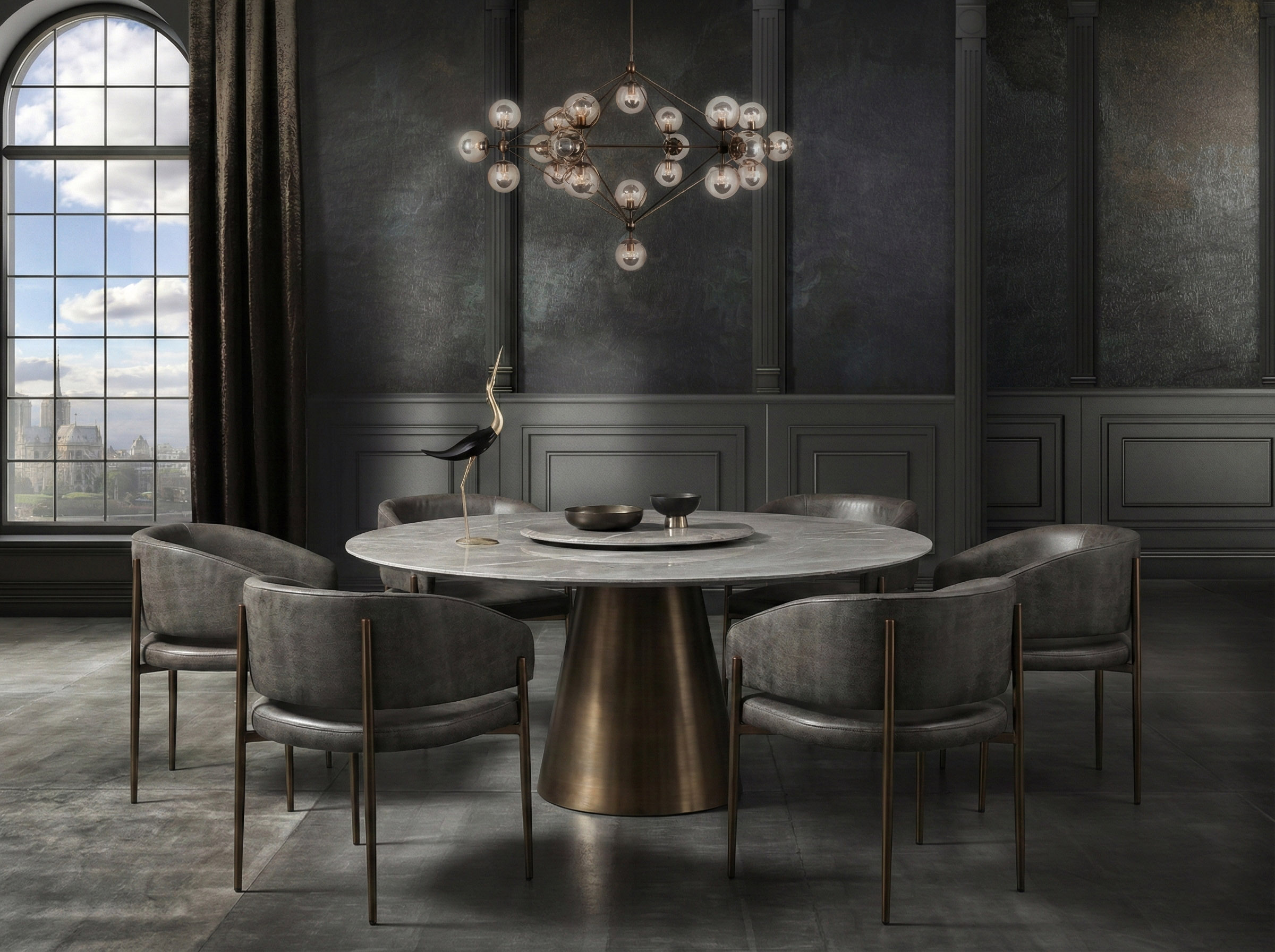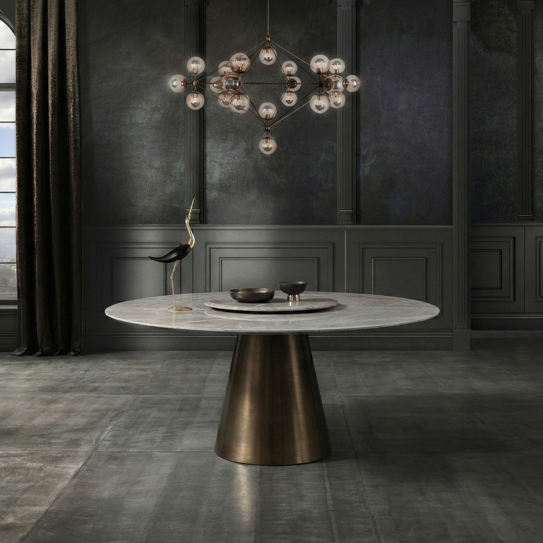 طاولة طعام ماليبو الدائرية هي قطعة عصرية مميزة تجمع بين البساطة النحتية والأناقة الراقية. تتميز بسطح رخامي دائري من نوع أبوان ستورم مع حافة مشطوفة مصقولة يدوياً تبرز جمال الحجر الطبيعي. ترتكز على قاعدة مخروطية معدنية بتشطيب أوكسي برونزي يضفي دفئاً وطابعاً حديثاً مع ثبات متين. كما تحتوي على قرص دوار عملي يزيد من سهولة الاستخدام، لتقدم مزيجاً مثالياً من الفخامة العملية والأناقة العصرية في مساحات الطعام الحديثة.