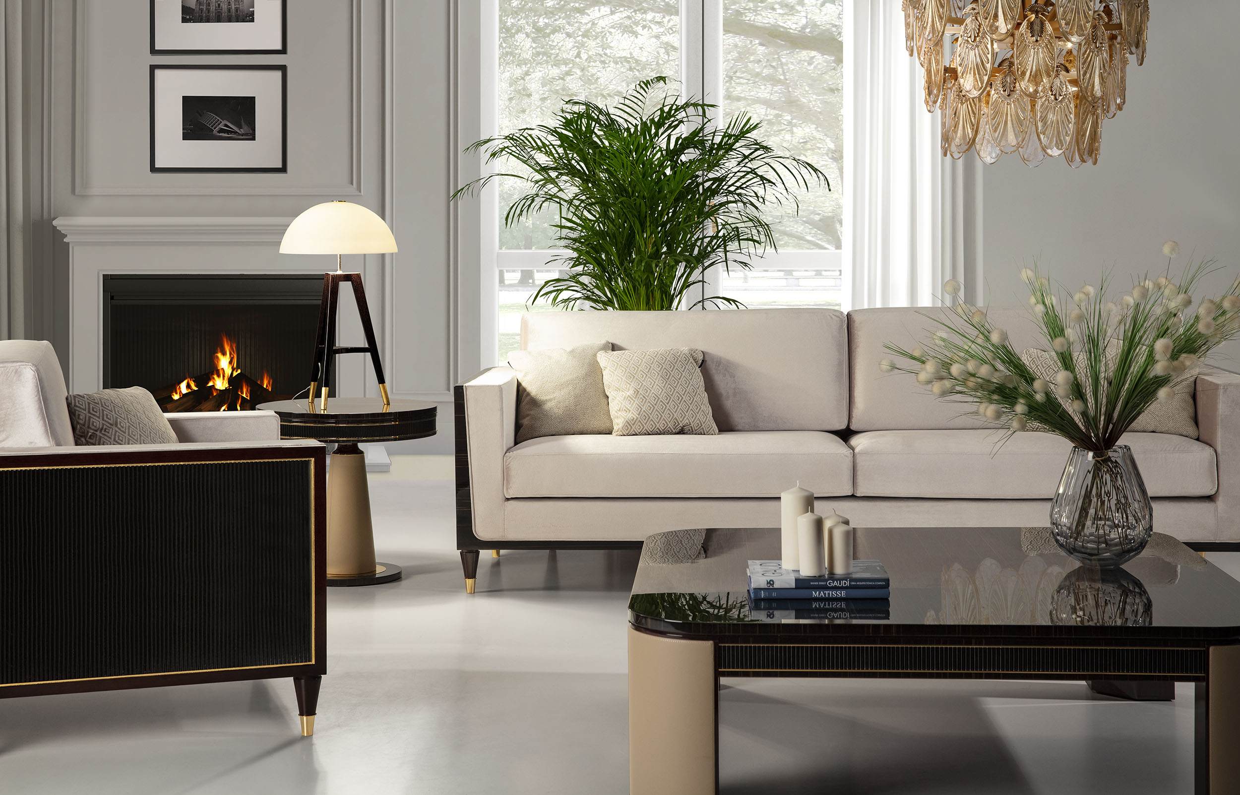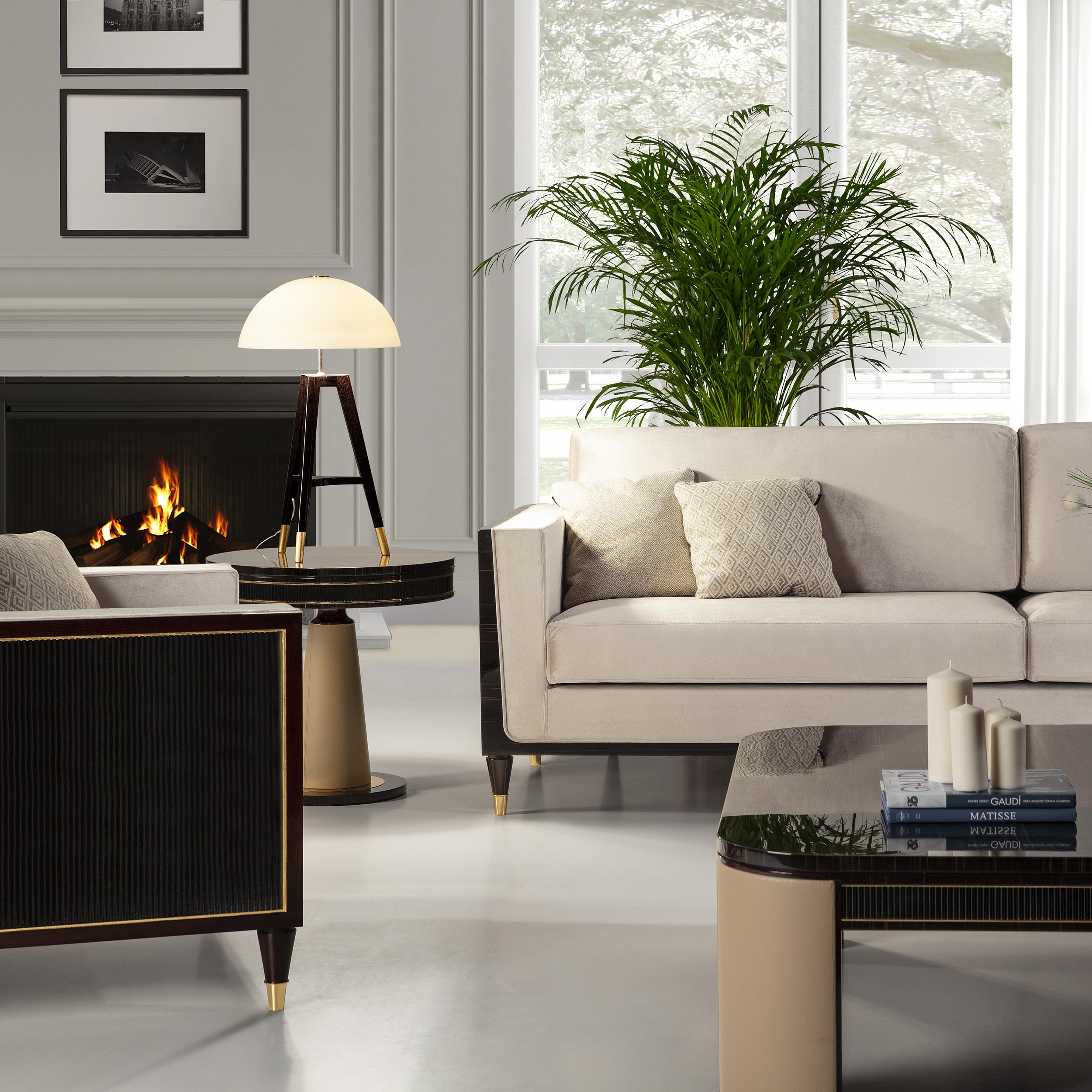 خشب ماكاسار أسود شديد اللمعان وخشب مصقول بورقة الذهب والنحاس المصقول.