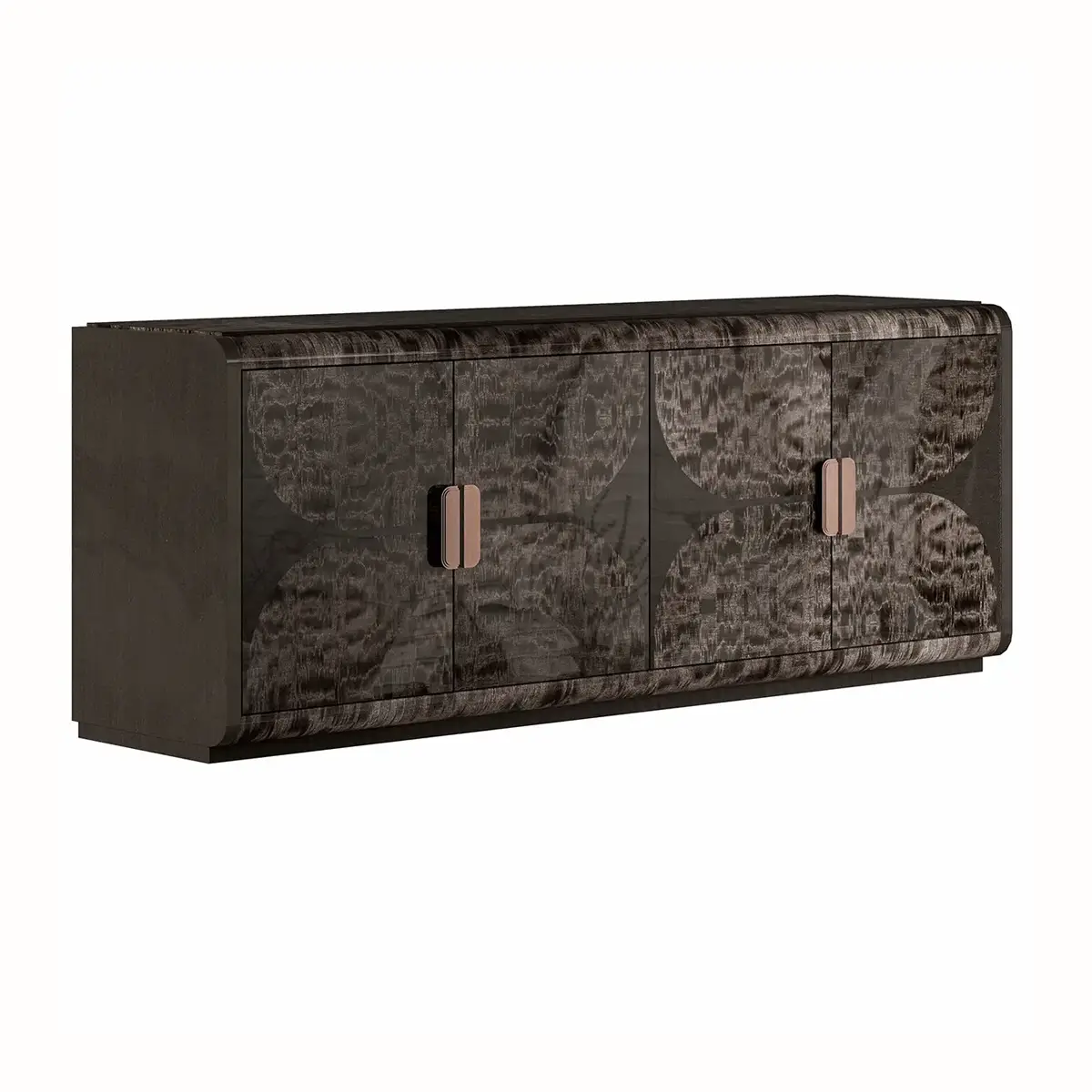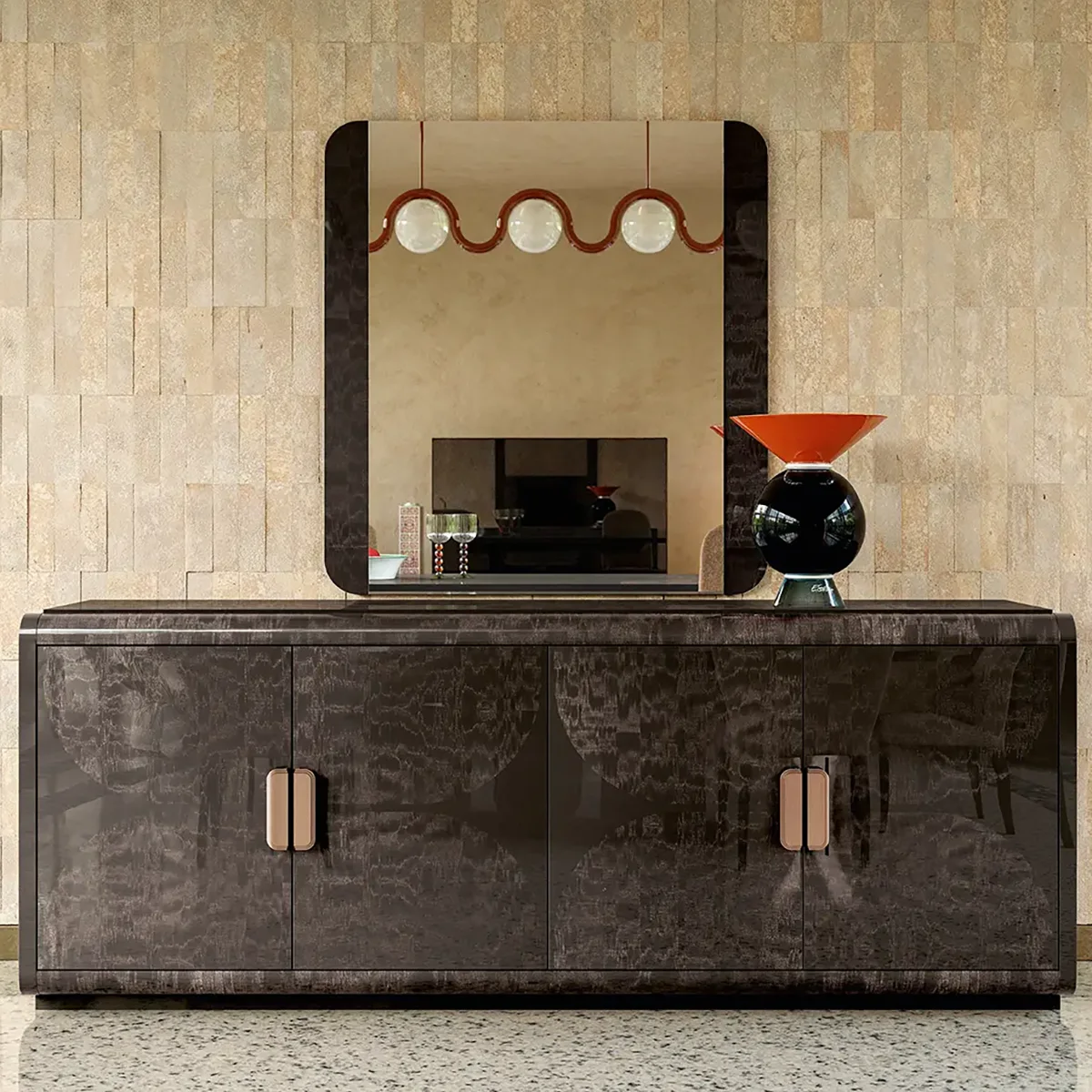 بوفيه ومرآة نيكس – ألف إيطاليا هي مجموعة تخزين راقية تعكس روح التصميم الإيطالي العصري بلمسة فخامة مُصقلة. يتميز البوفيه بتشطيب خشبي لامع بلون شوكولاتة غني مع لمسات من الذهب الوردي تضفي تبايناً أنيقاً وجاذبية عصرية متوازنة. يوفر تصميمه الانسيابي مساحة تخزين عملية مع حضور بصري فاخر. وتكمل المرآة المتناسقة المجموعة بإضافة عمق وإشراقة للمساحة، لتمنح تناغماً مثالياً بين الدفء والبريق والطابع المعماري الحديث.
