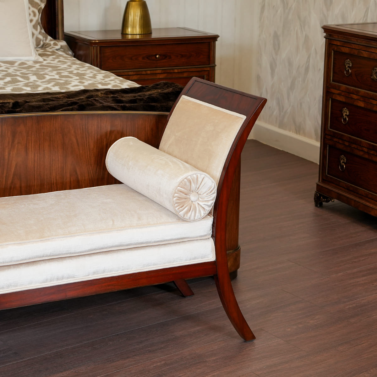 يتميز مقعد "أوليفر" بتصميم راقٍ مصنوع بإتقان من خشب الماهوجني الصلب وقشرة الماهوجني والقشرة المزخرفة، حيث يجمع بين المتانة والخامات الغنية ليضفي لمسة من الأناقة الكلاسيكية على أي مساحة داخلية.
