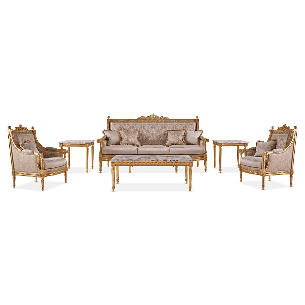 أريكتان بثلاثة مقاعد مع كرسيين وطاولة وسط وطاولتين جانبيتين
