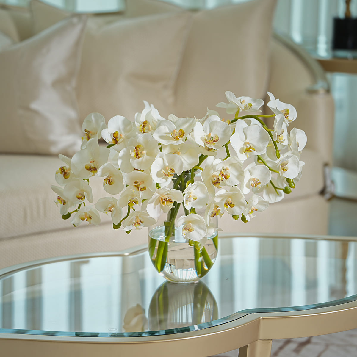 أضف لمسة من الأناقة والهدوء إلى مساحتك مع حديقة الأوركيد الفالوبالينسيس الصناعية. يتميز هذا الترتيب المصنوع ببراعة بأزهار الأوركيد الفالوبالينسيس الصناعية الواقعية المعروضة بشكل فني مع عناصر مياه صناعية تحاكي الواقع، مما يخلق ديكورًا هادئًا ومنعشًا مستوحى من الحدائق ولا يتطلب أي صيانة.