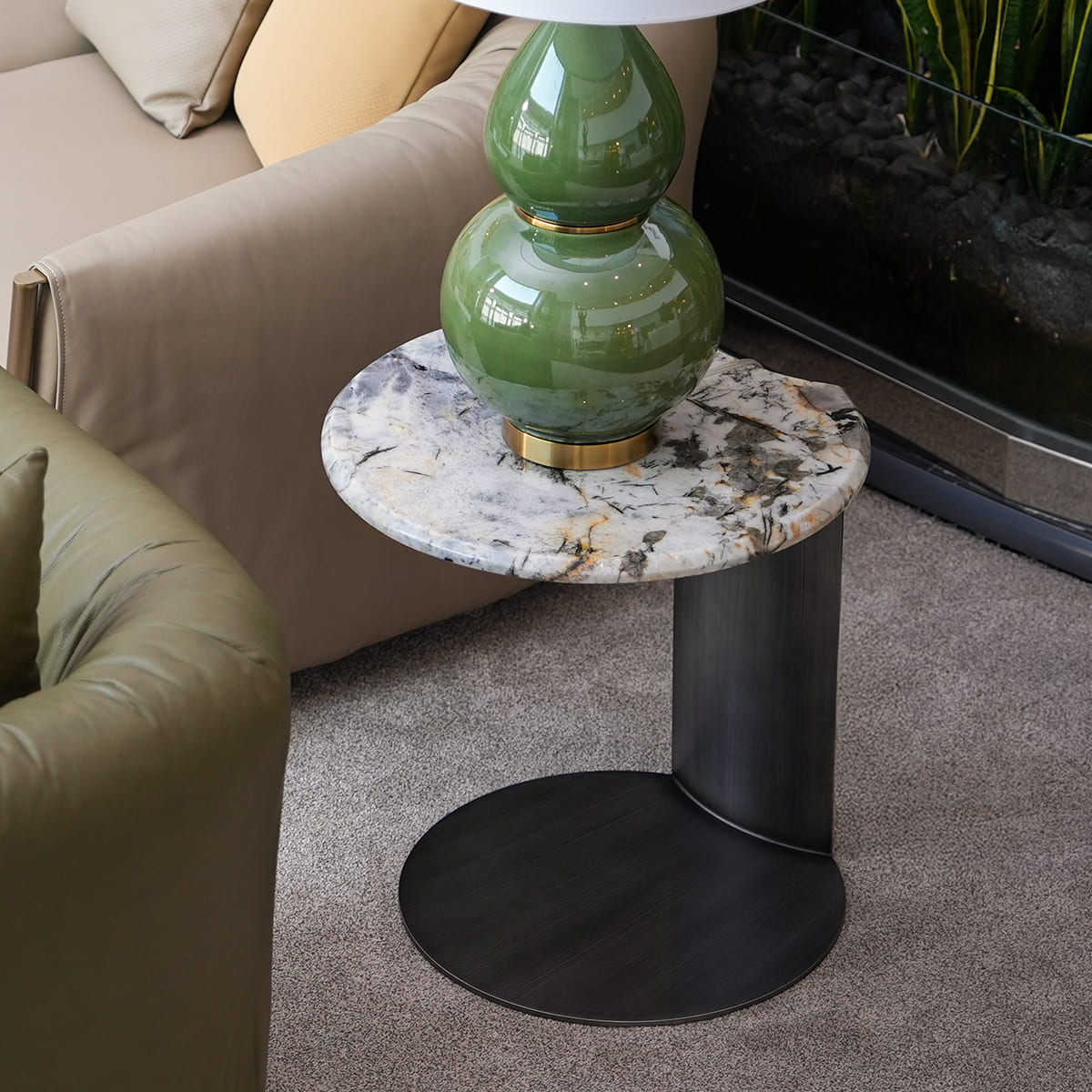 القطعة تتميز بالبرونز العتيق الفضي مع سطح من الرخام الطبيعي المصقول بنقوش الفراشة الذهبية، وتكملها قاعدة معدنية مطلية بالفضة المصقولة. يجمع التصميم بين الرخام الطبيعي والإطار المعدني، مما يضيف لمسة من الأناقة والرقي، ويجمع بين المواد الخالدة والحرفية العصرية.