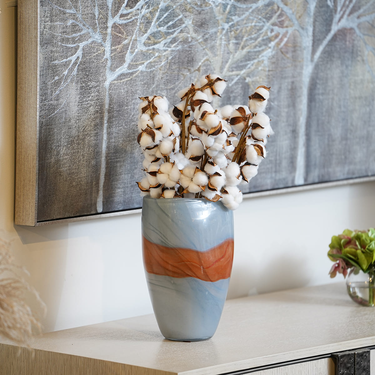 تتبع الخطوط الرمادية الداكنة طريقها عبر سطح مزهريات باكايا، بينما تتم إضافة طبقة من الزجاج البرتقالي المنصهر على قاعدة زجاجية باللون الرمادي الفاتح. تُصنع هذه المزهريات الكبيرة مفتوحة الفوهة بواسطة حرفيين يعملان معًا بتناغم لابتكار مزيج ديناميكي يجمع بين اللون والحرفية، بحيث يتميز كل منها بطابع فريد وتباين فني خاص. تتوفر بحجمين مختلفين.