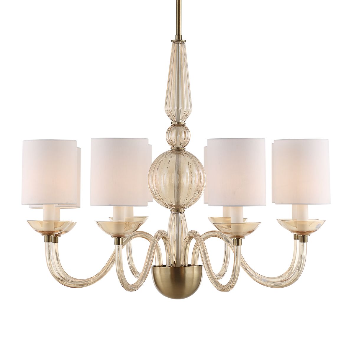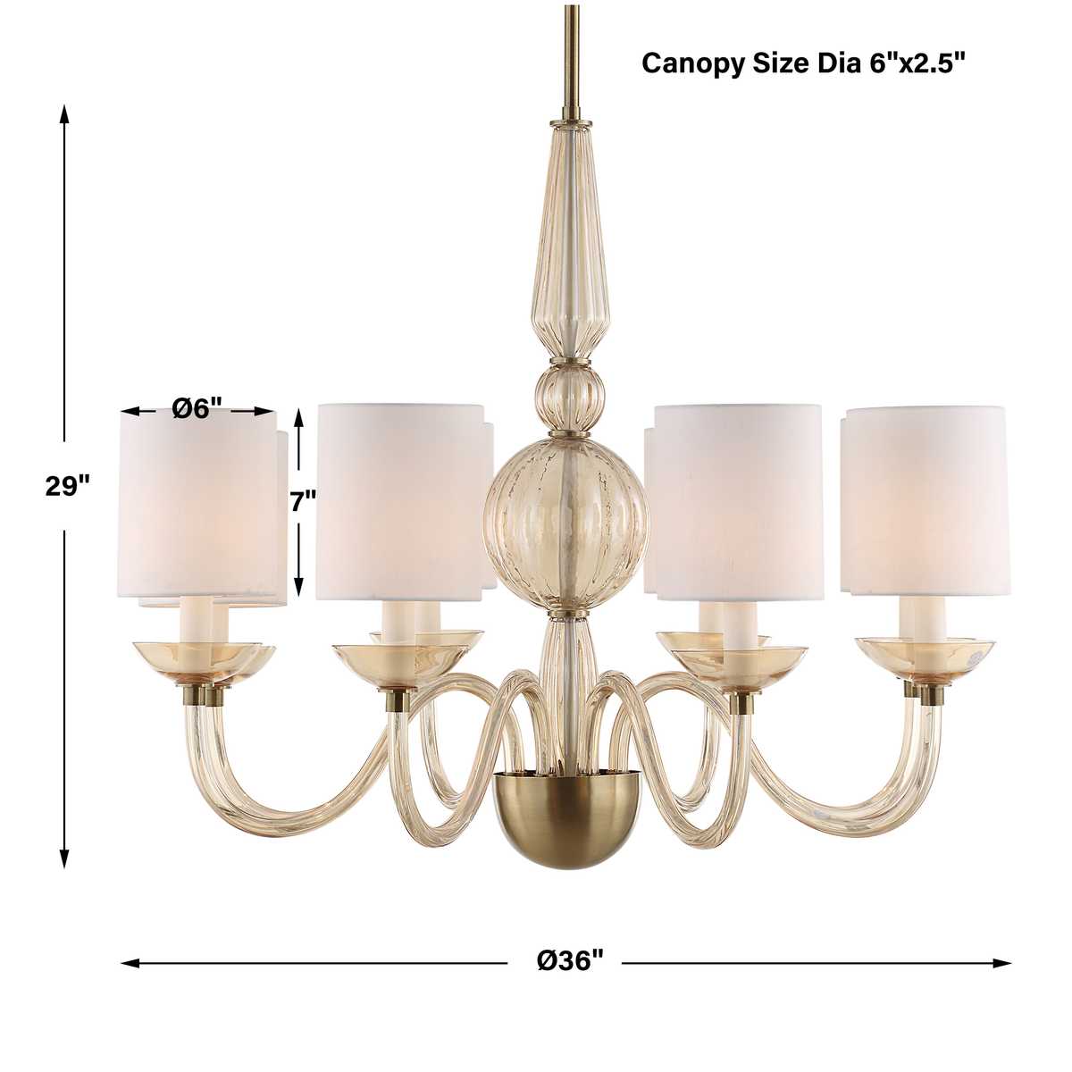 استُوحي تصميم ثريا بالاتزو ذات الأذرع الثمانية من ثريات مورانو الإيطالية التي صُنعت في أواخر الأربعينيات، وتتميز بزجاج منفوخ بلون الشامبانيا مع تفاصيل معدنية بتشطيب نحاسي، إضافة إلى أغطية مخروطة الشكل مصنوعة من حرير صناعي أبيض بتصميم صلب. تأتي الثريا بثماني قواعد لمبات من نوع كاندلابرا بقدرة قصوى 60 واط لكل واحدة. اللمبات غير مرفقة.