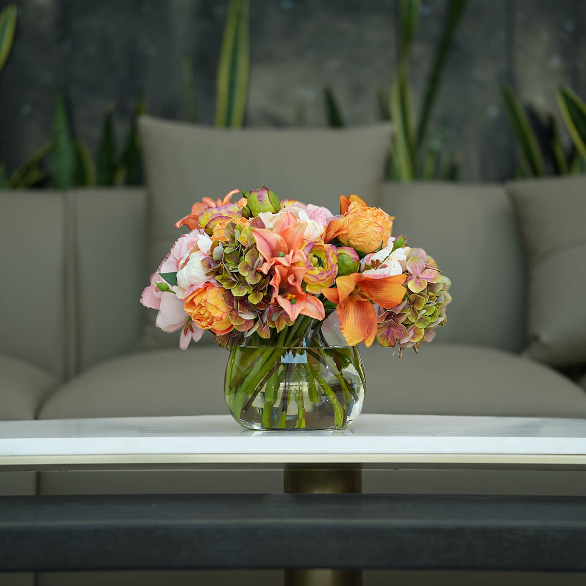 أضف لمسة من الجمال الخالد إلى منزلك مع تنسيق الفاوانيا والراننكولاس المرتب بأناقة داخل مزهرية زجاجية مع إناء ماء. بارتفاع ٢٨ سم، يمنحك هذا التصميم الصناعي لمسة من الرقي، ليكون مثالياً كقطعة مركزية على طاولات الطعام أو للعرض على الرفوف والكونسول. تصميم أنيق يحافظ على إشراقه وجاذبيته طوال العام من دون أي عناية.