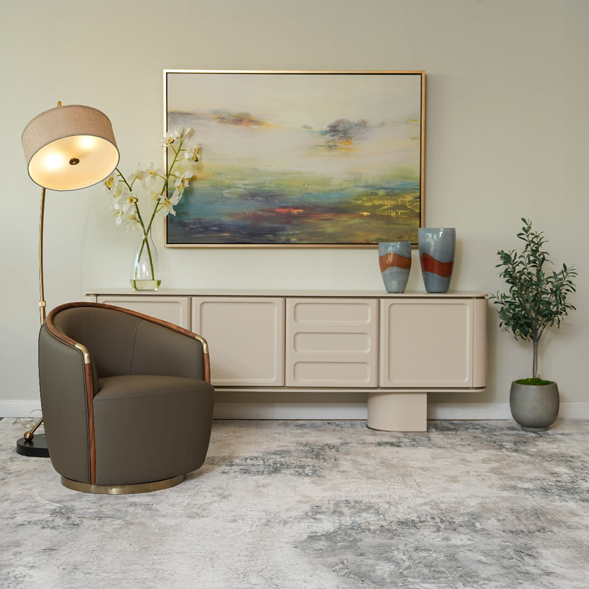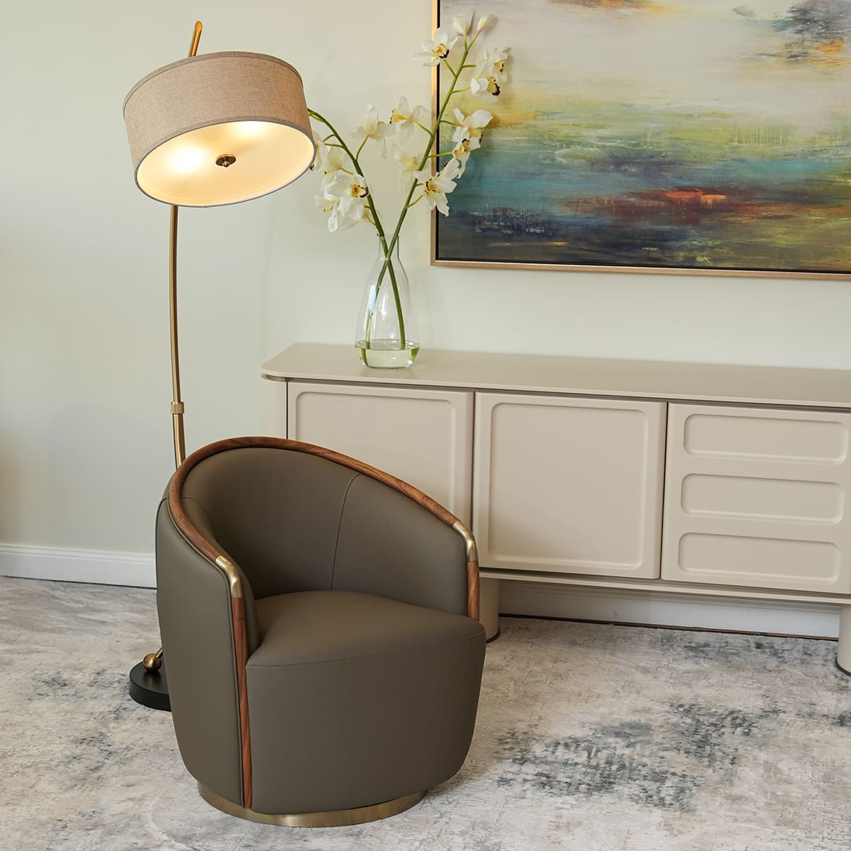 الكرسي يتميز بجلد بني فاتح مع لمسات من الذهب الفاتح، مع رغوة عالية الكثافة من الداخل وجلد أصلي (RL009) في الجهة الأمامية وميكروفايبر جلد عالي الجودة (ML010) في الجهة الخلفية. كما يكتمل بذراعين من الجوز الصلب بتشطيب طبيعي وقاعدة من الفولاذ المقاوم للصدأ مع وظيفة التدوير باللون الذهبي الفاتح. تضفي المفروشات من جلد القمة وميكروفايبر الجلد شعورًا بالفخامة والمتانة على الكرسي.