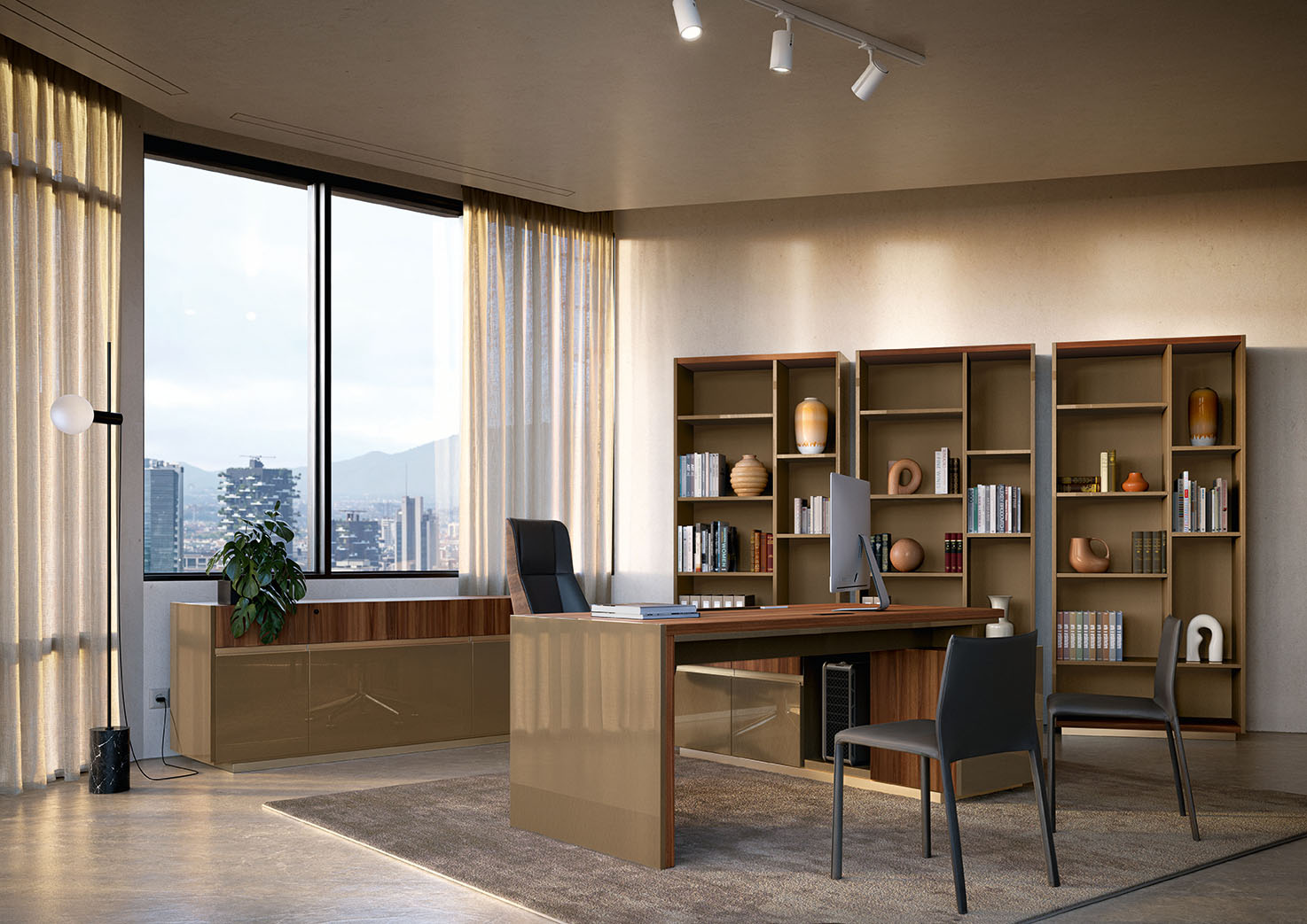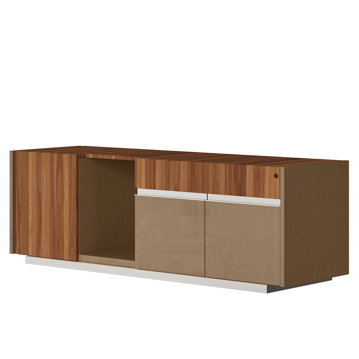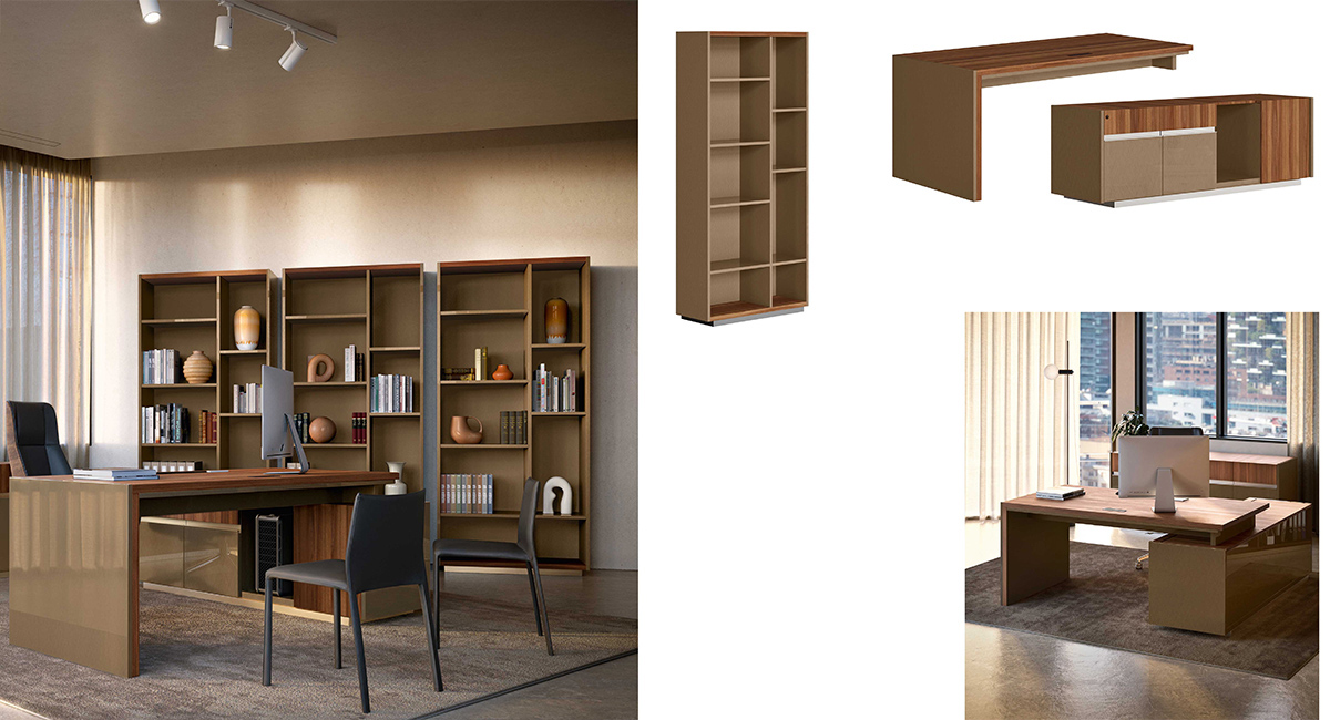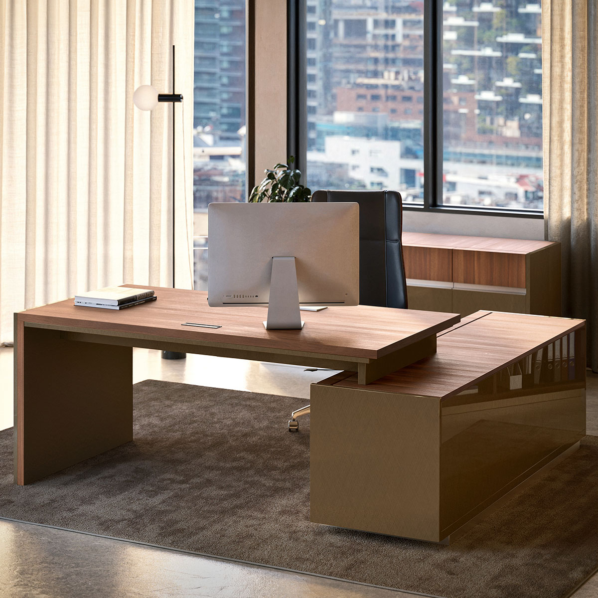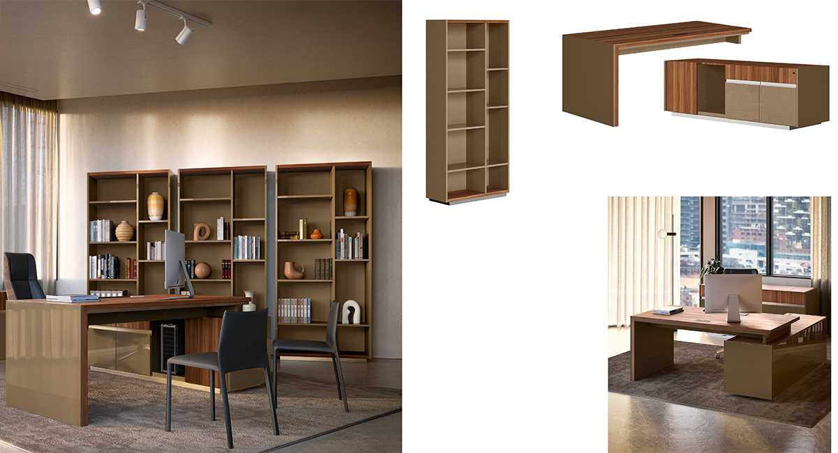 يتميز مكتب رومانا بارت بحرفية راقية مع قشرة خشب الجوز بتشطيب لامع برونزي مصقول. صُنع الهيكل من ألواح مضغوطة متينة مكسوة بقشرة خشبية أنيقة، وتكمله وحدة مكتبة من قشرة الجوز مع ألواح ميلامين. تصميم أنيق يجمع بين العملية والطابع الكلاسيكي العصري، ليكون إضافة راقية لأي مساحة عمل.
