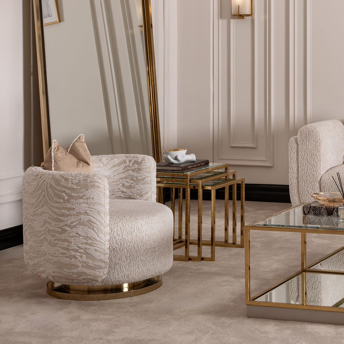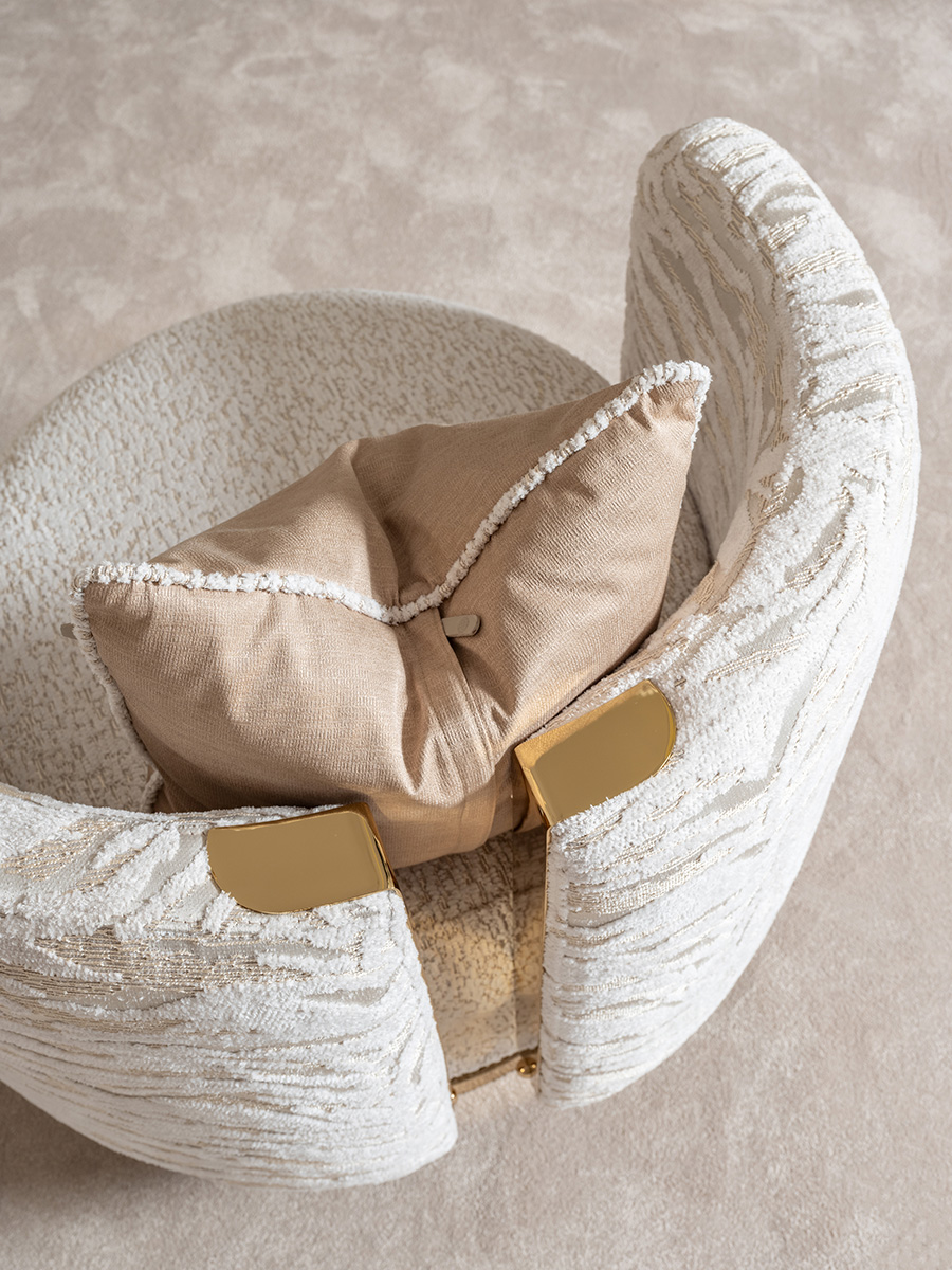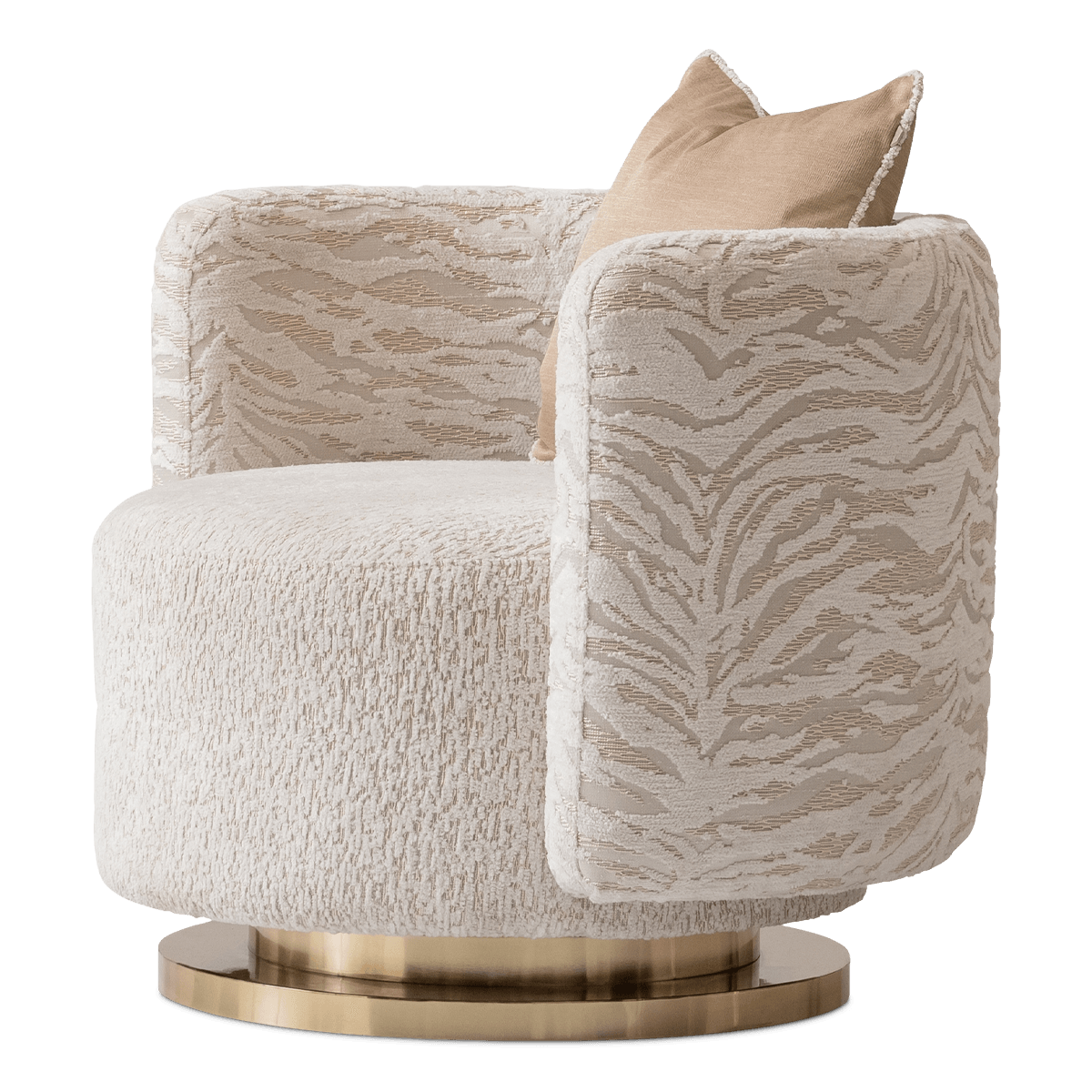 لفّ نفسك بأناقة آسرة مع كرسي سافانا بريز الدوّار. يتميز بتنجيد فخم من قماش شينيل جاكار بنقشة حيوانية جريئة تجمع بين الفن والراحة المترفة، لتدعوك للاسترخاء بأسلوب راقٍ. القاعدة الدوّارة بزاوية 360 درجة مصنوعة بتشطيب ذهبي لامع تضفي أساسًا مشرقًا وانسيابية في الحركة، بينما يمنح التفريغ الخلفي المزدان بلمسة ذهبية لمسة من البريق والفخامة. يجمع هذا الكرسي بين التصميم الجريء والتفاصيل الراقية ليكون قطعة بارزة تخطف الأنظار من كل زاوية. التشطيب: ذهبي لامع.