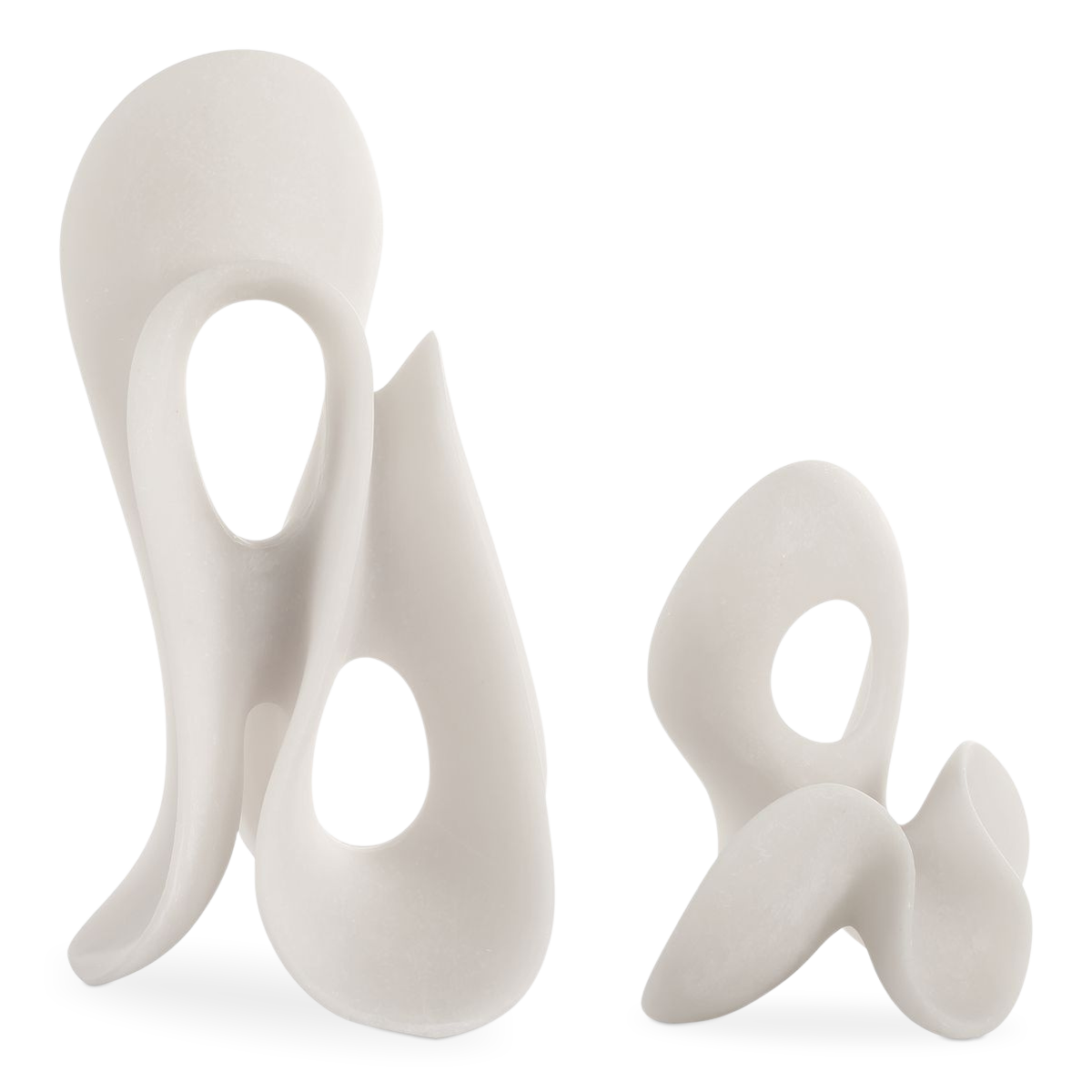 يضم هذا الطقم قطعتين من المنحوتات العصرية المصممة بأسلوب انسيابي يجمع بين الخطوط الناعمة والانحناءات الأنيقة مع فراغات مجوّفة تمنح كل قطعة عمقًا بصريًا مميزًا. صُنعت من حجر صناعي بلون أبيض مطفأ يحاكي بدقة مظهر رخام ثاسوس الفاخر، لتضيف لمسة راقية وعصرية إلى أي مساحة. مناسبة للاستخدام الداخلي والخارجي.