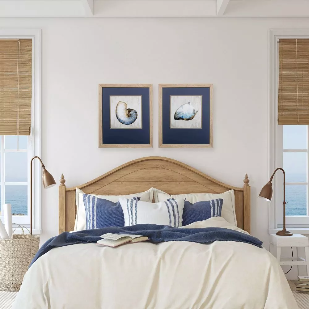 مجموعة من صورتين لأصداف بحرية مزودة بحاشية مزدوجة مع حاشية سفلية سميكة. مغلفة بالزجاج ومؤطرة بإطار خشبي مستوحى من الطابع الساحلي.