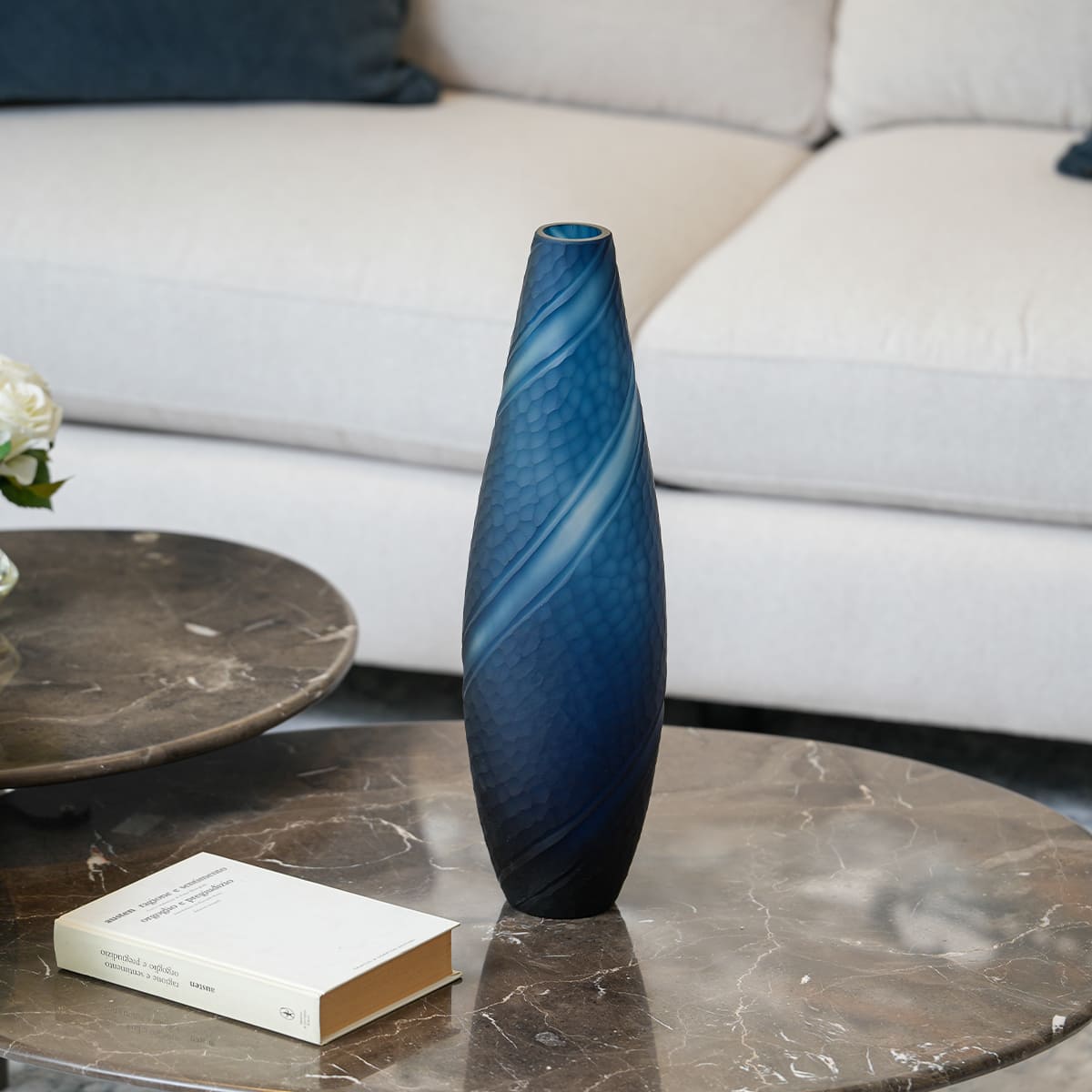 مصنوعة من الزجاج المصفح، تتميز مزهريات سولانو بتفاصيل محفورة يدويًا تضيف نسيجًا وعمقًا إلى التصميم الانسيابي. تسمح الألوان الزرقاء والرمادية المتناسقة باستخدام هذه المزهريات النحيفة بشكل منفصل أو معًا. كل مزهرية هي قطعة فريدة تمامًا، حيث تضيف الاختلافات المميزة لمسات دقيقة تعزز شخصيتها المتفردة. تتوفر بثلاثة أحجام مختلفة.