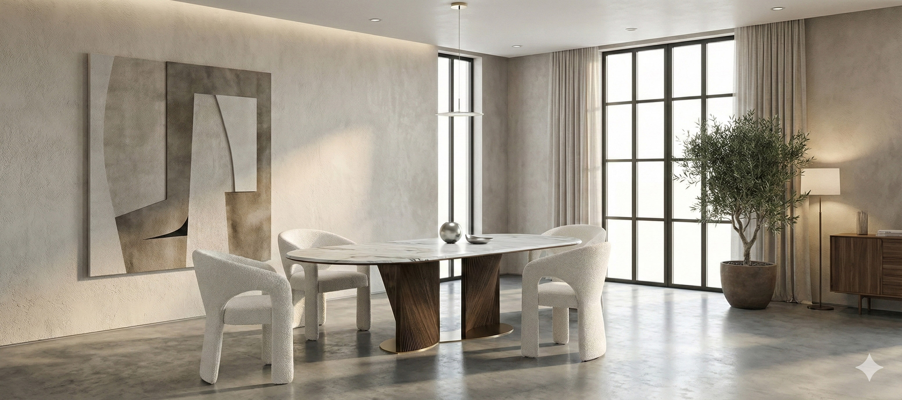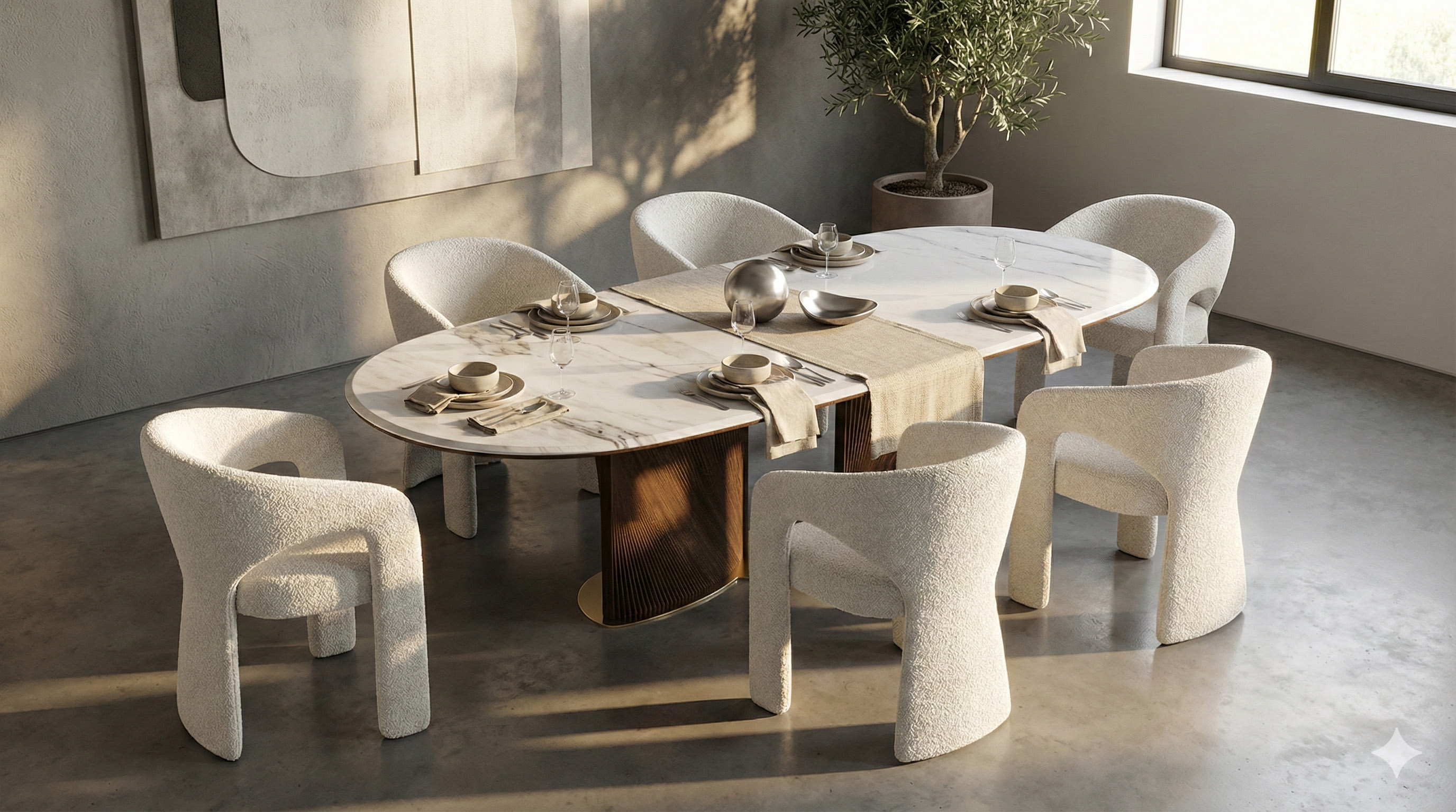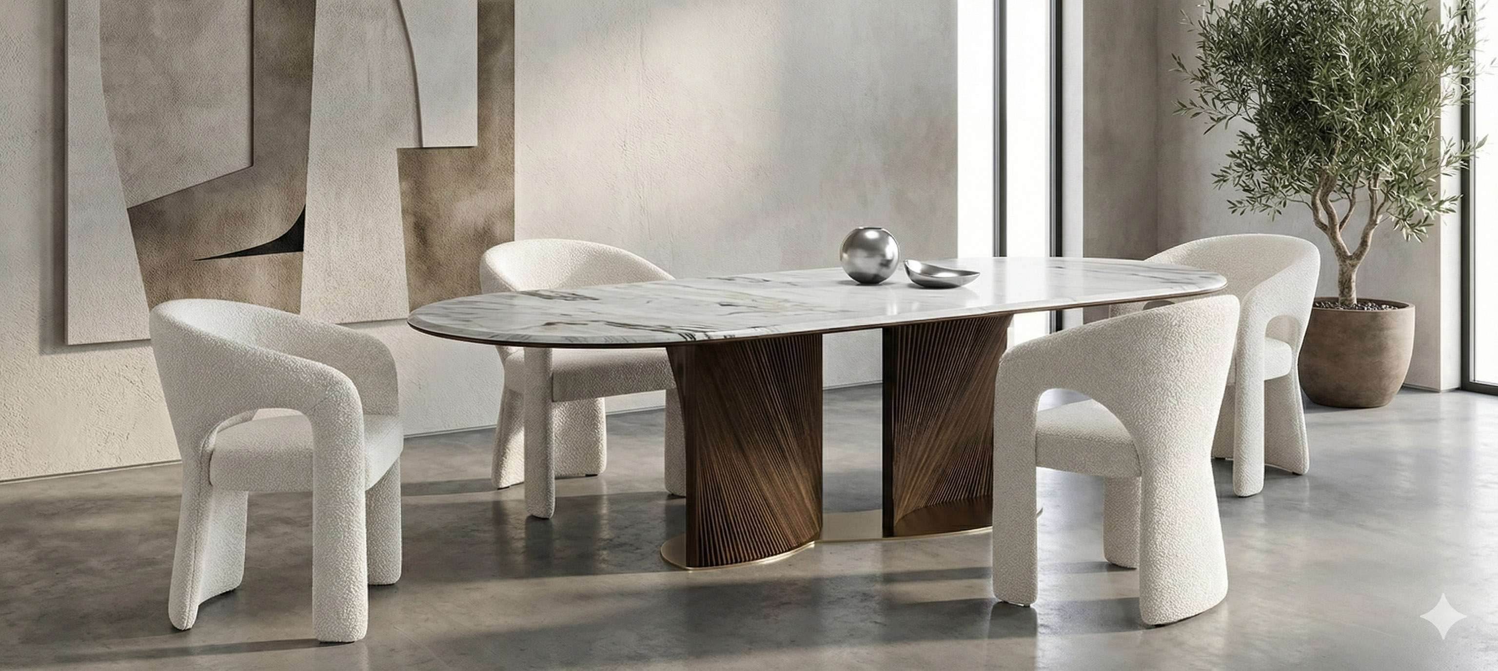 طقم طعام ستاردست هو مجموعة فاخرة تجمع بين الأناقة الطبيعية والرقي العصري. تتميز الطاولة بسطح رخامي طبيعي مصقول من ستاردست يبرز عمق العروق الحجرية وجمالها، وترتكز على أرجل قاعدة من خشب الدردار الصلب بتشطيب بني فاتح يضفي دفئاً ومتانة هيكلية. تعزز القاعدة المعدنية السفلية بتشطيب فضي مصقول الثبات مع لمسة حديثة أنيقة. وتكتمل المجموعة بكراسٍ مُنجدة بالكامل بقماش كريمي أبيض مع حشوة إسفنجية عالية الكثافة توفر راحة استثنائية، بينما تضيف القاعدة المعدنية بتشطيب نحاسي مصقول لمسة فخامة ومتانة متناغمة، لتقدم تجربة طعام راقية ومتكاملة.
