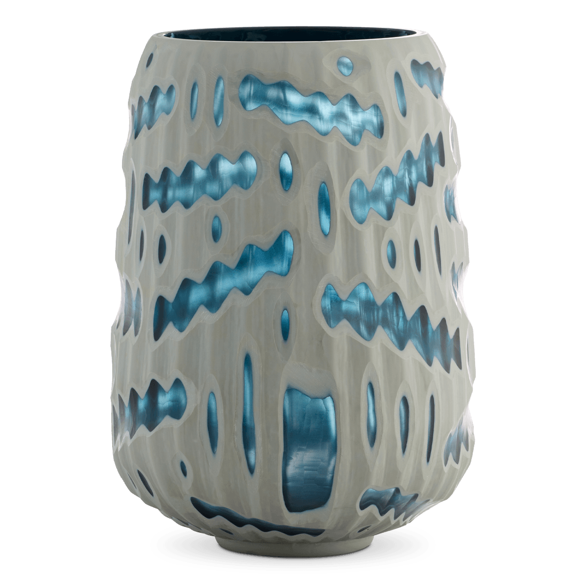مزاهير ستراتا تتميّز بطبقة خارجية سميكة من الزجاج الأبيض تغلّف طبقة داخلية بلون أزرق هادئ. ينحت الحرفيون الماهرون نقشًا مخططًا دقيقًا على السطح، ثم يقطعونه بعمق كافٍ ليكشفوا عن لمحات من الدرجات الزرقاء الغامقة في الداخل. يضفي التموج غير المنتظم للتصميم المستوحى من الزخارف القبلية طابعًا فنيًا فريدًا على كل قطعة، مما يجعلها عملًا فنيًا قائمًا بذاته.