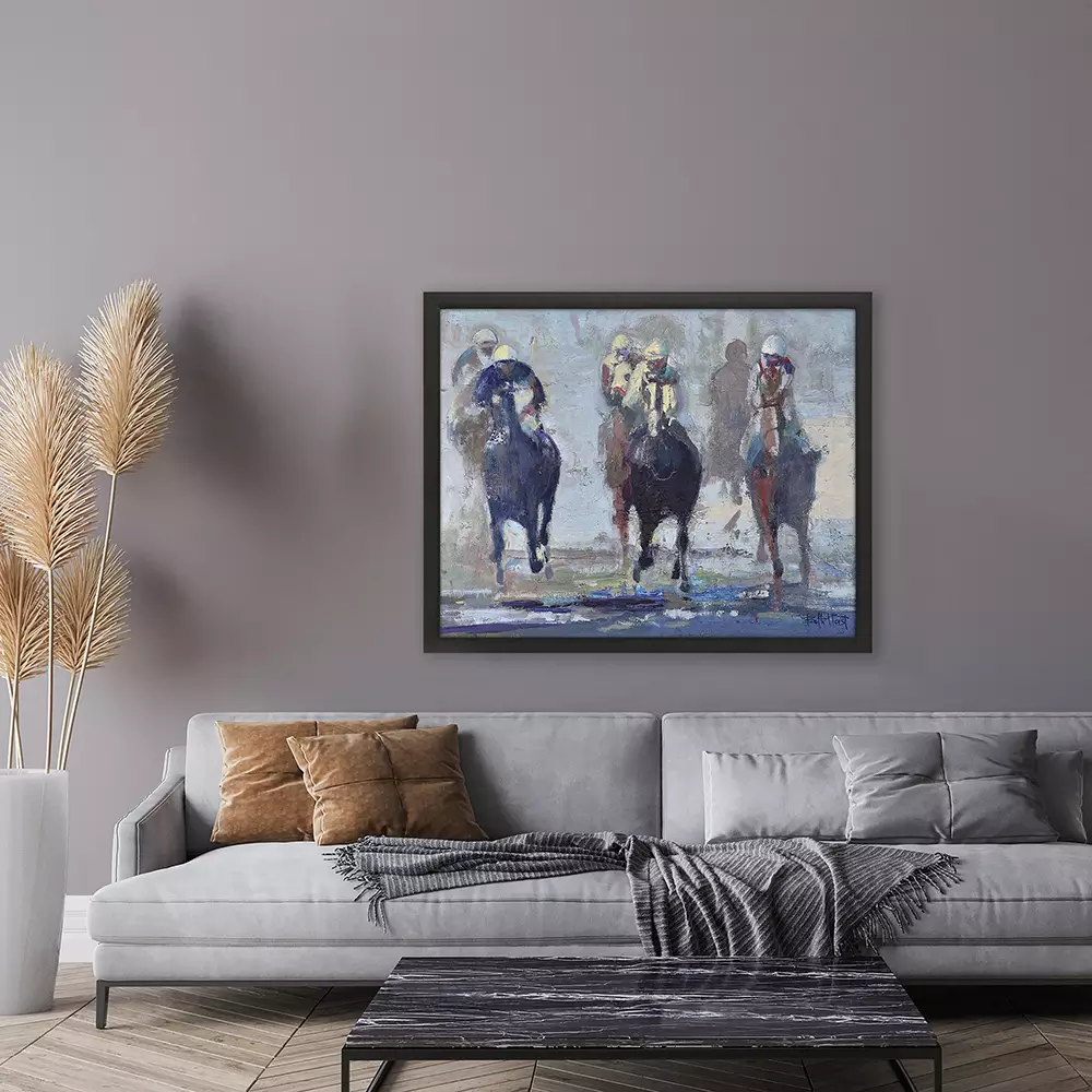 خيول تتسابق نحو خط النهاية في المضمار. مؤطرة بإطار خشبي أسود بتصميم عصري على شكل كتلة.