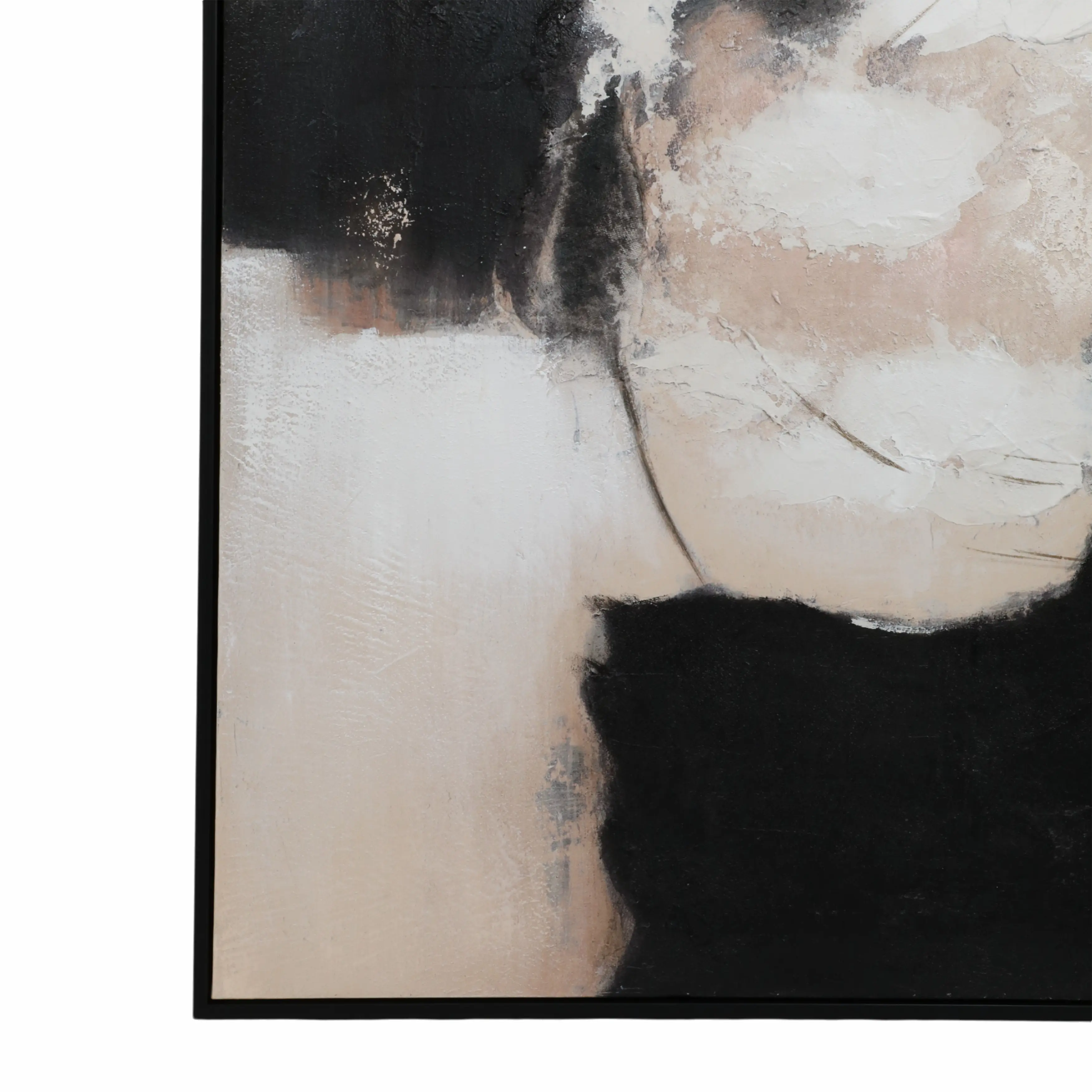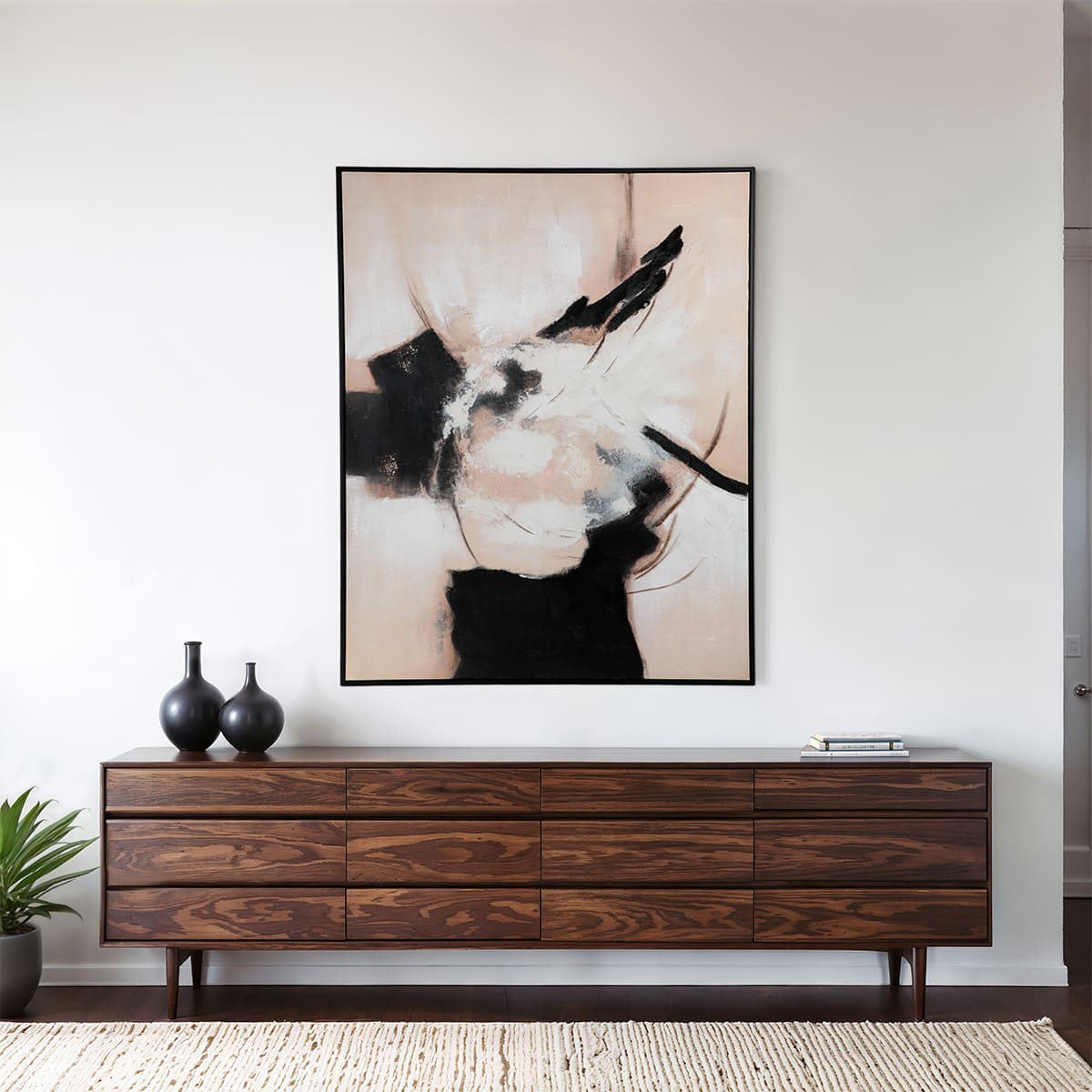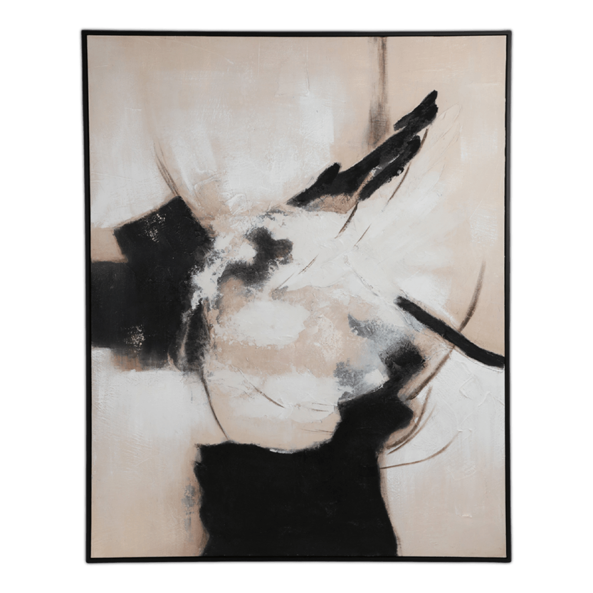 لوحة أوزيما المرسومة يدوياً تضيف عمقاً فنياً وملمساً تعبيرياً من خلال تصميمها المنفَّذ بالريشة على القماش، مما يجعلها نقطة محورية لافتة تضفي حضوراً قوياً على أي مساحة.