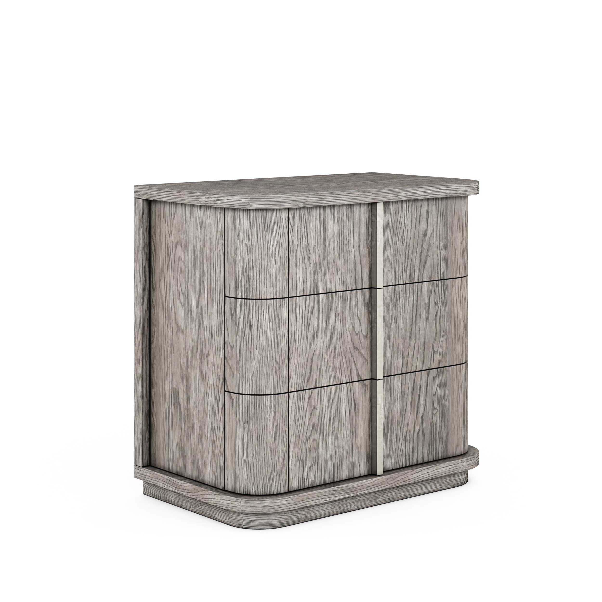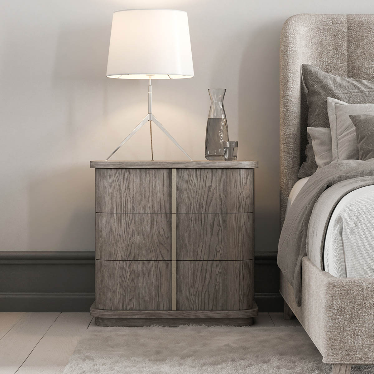 طاولة سرير فولت الجانبية هي قطعة أنيقة ومدمجة تتميز بخطوط أفقية واضحة تتوازن مع زوايا منحنية ناعمة في الواجهة. يمنحها هذا التصميم طابعاً معمارياً عصرياً مع إحساس دافئ ومريح، مما يجعلها إضافة عملية وراقية لغرف النوم الحديثة.